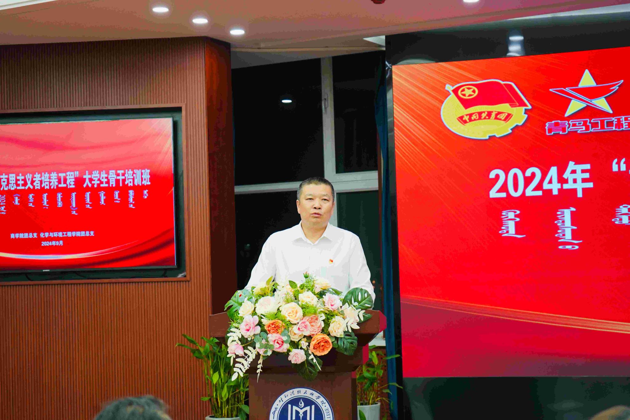 为深入学习贯彻落实党的二十届三中全会精神、习近平新时代中国特色社会主义思想、习近平总书记关于青年工作的重要思想,切实加强学生骨干队伍建设,着力培养信仰坚定、能力突出、素质优良、作风过硬的青年政治骨干,2024年9月26日,商学院与化学与环境工程学院联合开展2024年“青年马克思主义者培养工程”大学生骨干培训班,开班仪式在综合楼12楼报告厅举行,化学与环境工程学院党总支书记鄂亚彬、商学院党总支副书记李云、化学与环境工程学院党总支副书记乌玉娜、马克思主义学院副教授王玉红、团委组织部部长乌依勒斯、商学院团总支书记华国庆、化学与环境工程学院团总支书记瑙莫汗出席,各学院青马班培训学员、学生骨干和入团积极分子共120余人参加。
