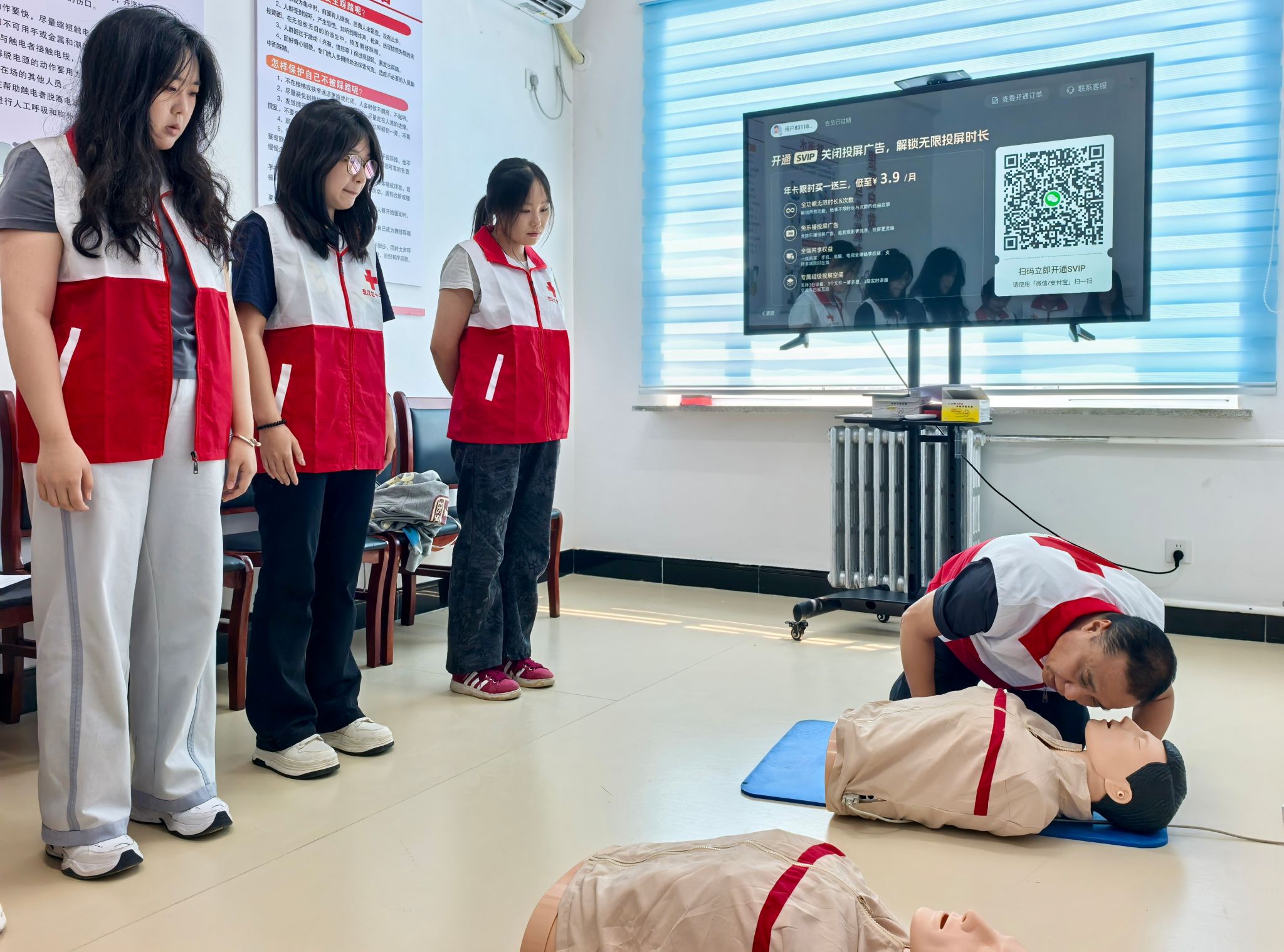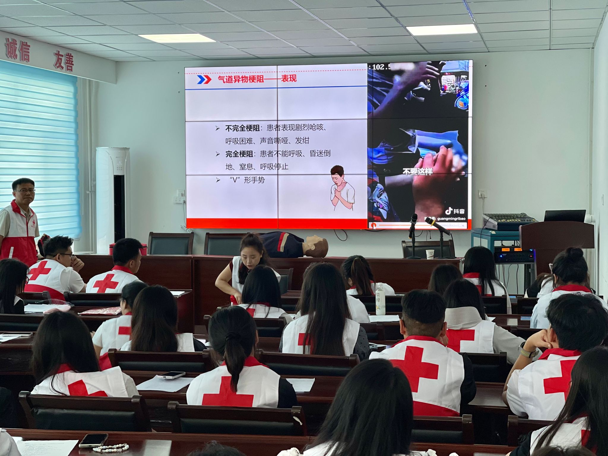 培训开篇,红十字会讲师围绕红十字精神展开,结合先天心脏病救助案例,阐释从事救护工作的意义,让志愿者理解“人道、博爱、奉献” 精神内涵,明晰守护生命的责任。随后,通过播放众人接力心肺复苏的救援视频,引出心搏骤停生存链知识,解析无心跳、无意识、溺水、气道梗阻等紧急状况下的救助逻辑,为理论学习筑牢基础。