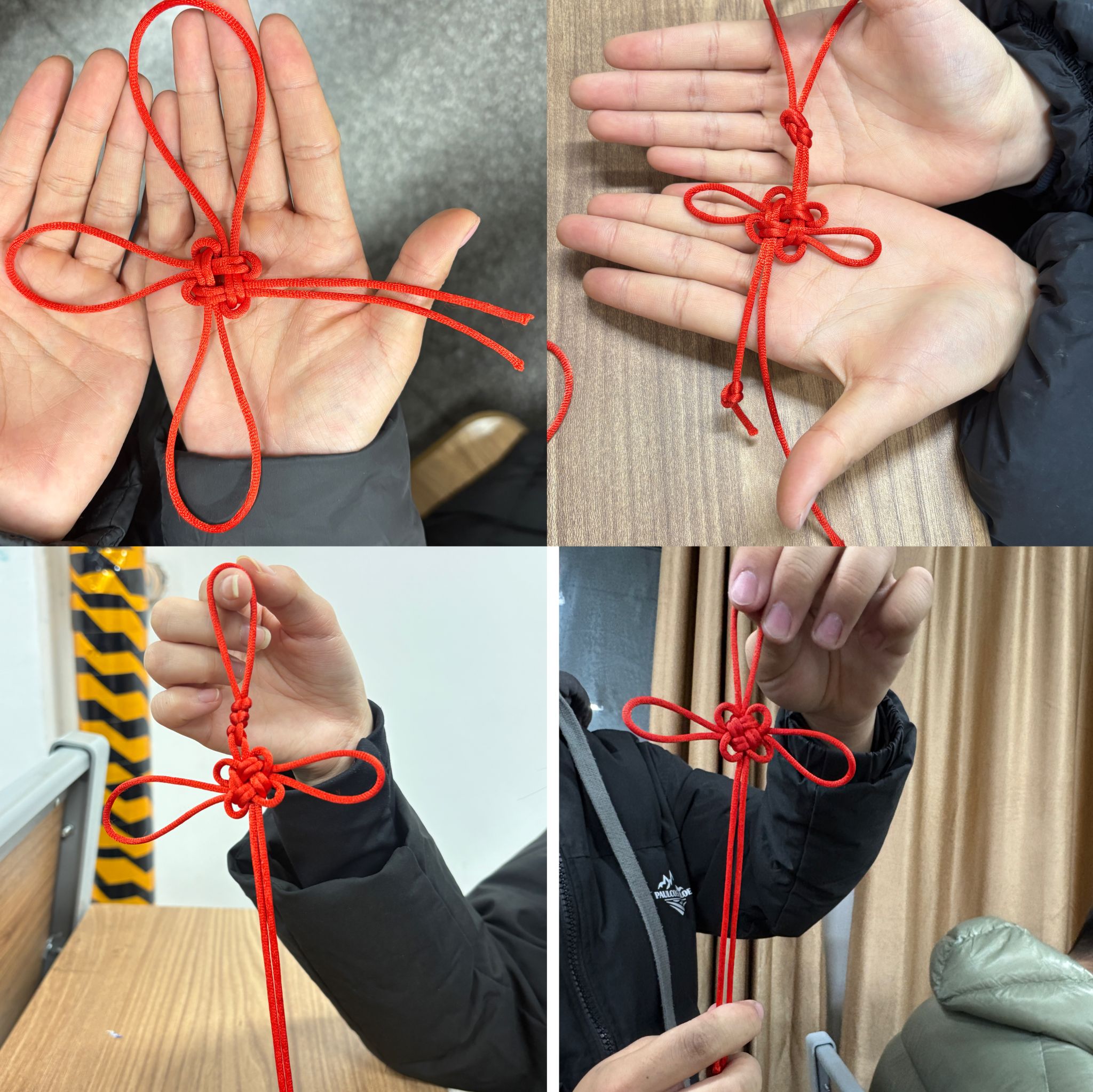 活动伊始,学生会成员向同学们介绍了中国绳结的悠久历史与文化内涵。从寓意吉祥的盘长结到小巧精致的吉祥结,每一个承载着美好祝愿的绳结样式,都引发了在场同学对这一非遗技艺的浓厚兴趣。同学们纷纷拿起红绳,认真钻研。起初操作生疏,而后渐趋熟练。在反复的穿引、缠绕过程中,一根根普通的红绳逐步转变为一个个精巧的绳结。活动现场大家相互交流技巧、分享创作心得。小小的绳结不仅连接起丝线,更拉近了彼此间的距离。一根根普通的红绳,在同学们手中几经缠绕、穿插,最终成为一个个精巧别致的绳结。当看到自己亲手制作的绳结作品时,大家的脸上都洋溢着满满的成就感。