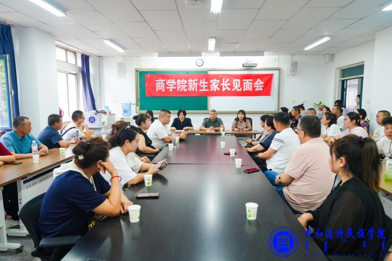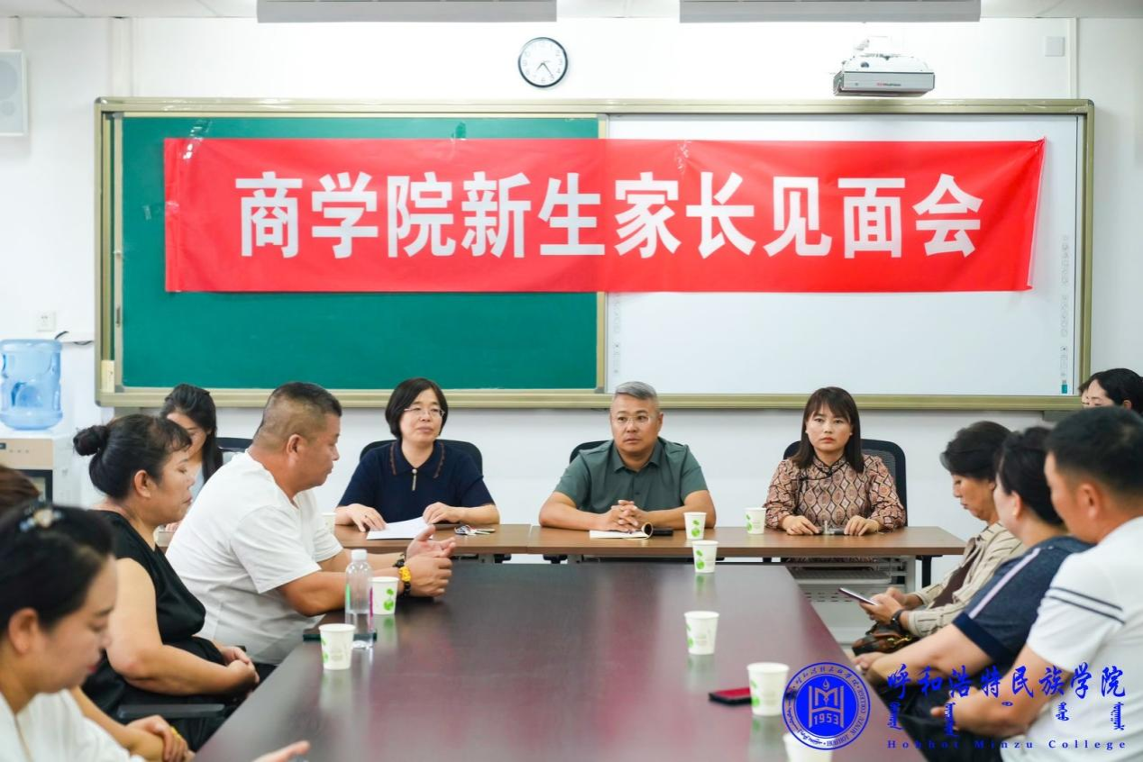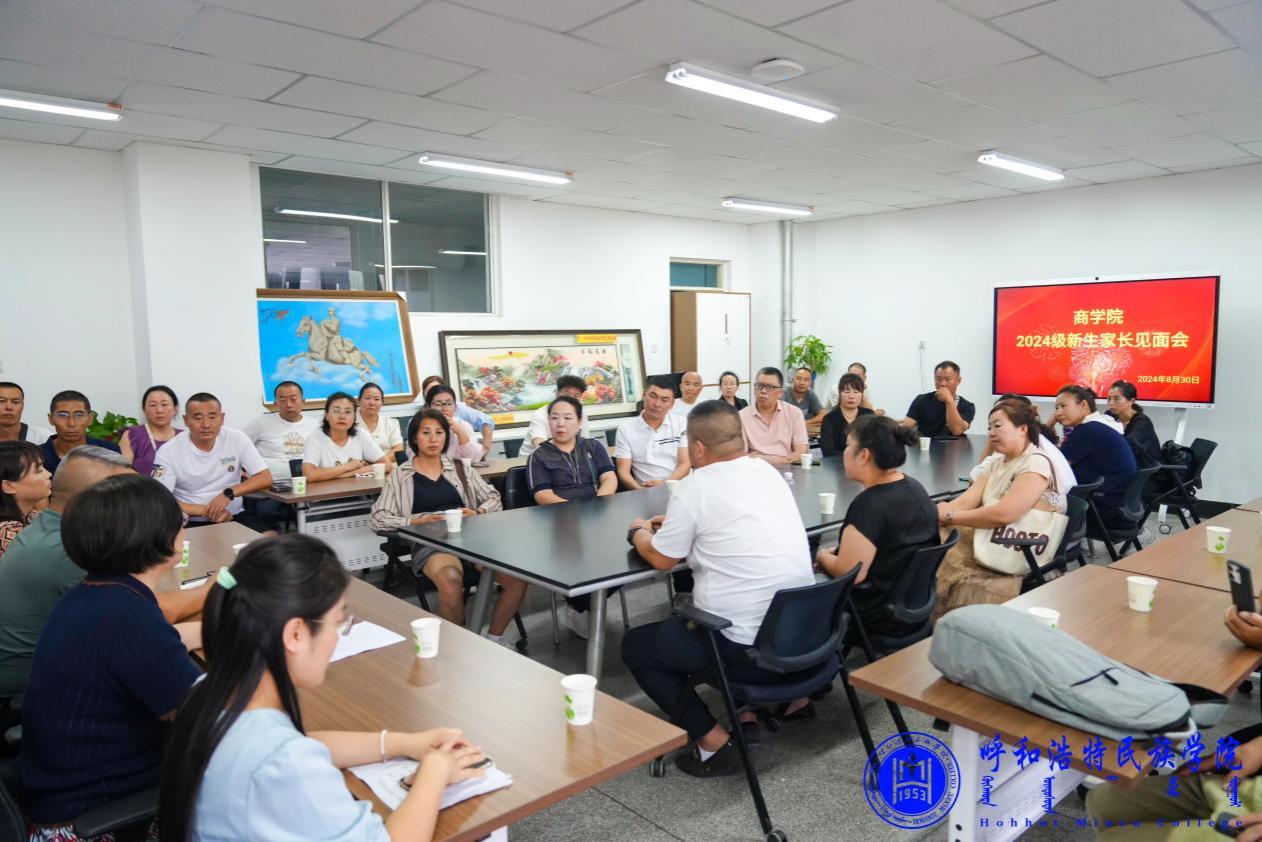 8月30日下午15:00时,在尚智楼310室商学院召开了2024级新生家长见面会。学院党总支书记周双喜、院长包诺敏、党总支副书记李云、新生班主任李志华、边雨桐、曹国利及50余名新生家长参加了此次见面会。