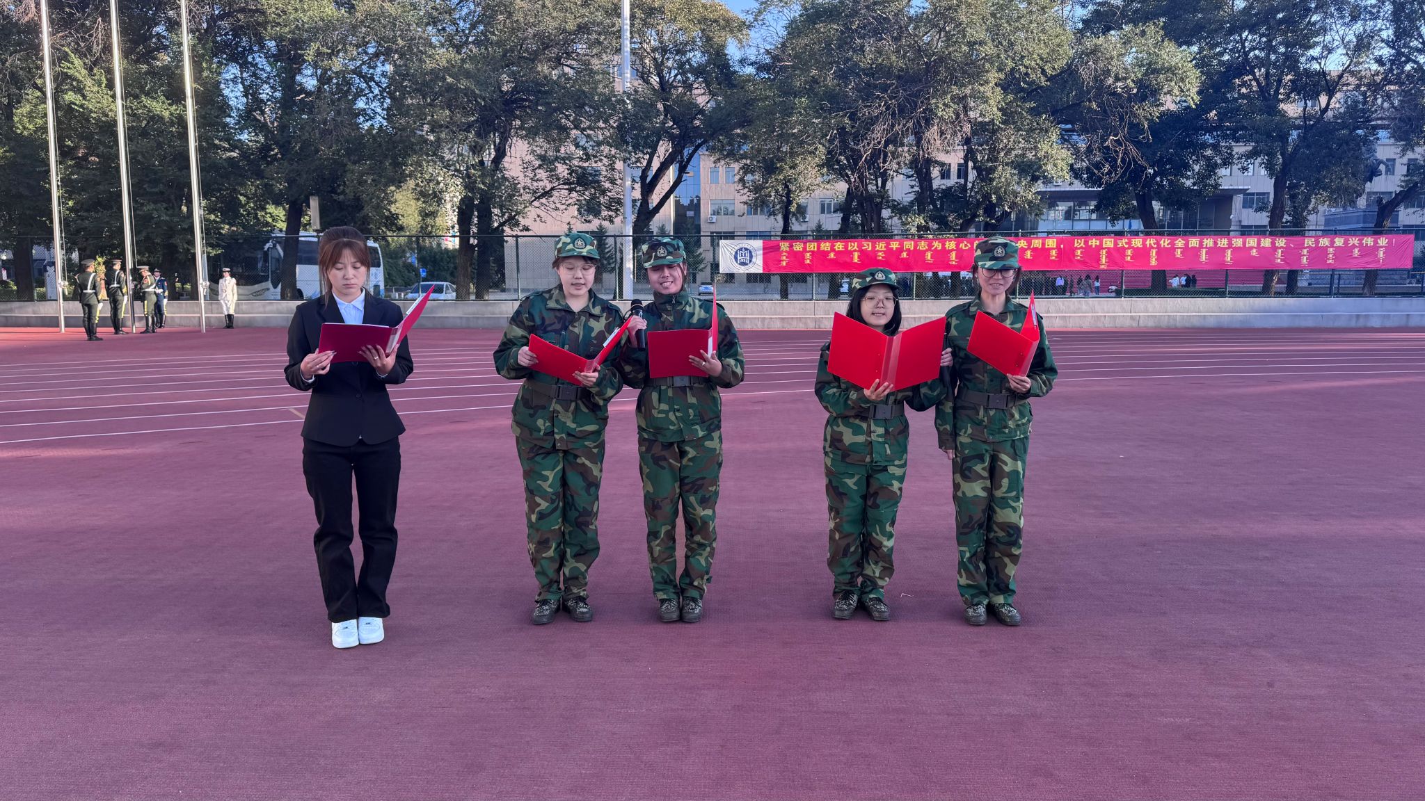 升旗仪式后,商学院4名学生代表围绕“青春与理想”“爱国爱党”“民族团结”“校史校情”四大主题,发表《青春的旗帜,在国旗下飘扬》联合演讲。他们立足青春视角,将个人理想与社会主义核心价值观、“四个意识”“四个自信”深度融合,表达出把个人成长融入党和国家事业的坚定决心;通过分享国防知识学习收获、军训感悟,诠释新时代青年爱国爱党的赤诚之心;结合校园内各民族同学共学共进的日常场景,以及在民族团结教育馆的所学所感,传递铸牢中华民族共同体意识的青春担当;回顾校史中前辈奋斗故事,分享优秀学长榜样事迹,抒发对母校的深切眷恋与为校增光的责任担当。最后,4名学子以“以理想为帆,以担当为桨,让青春在奋斗中绽放绚丽光芒”立誓,展现商学院青年肩负时代使命、勇毅前行的精神风貌。