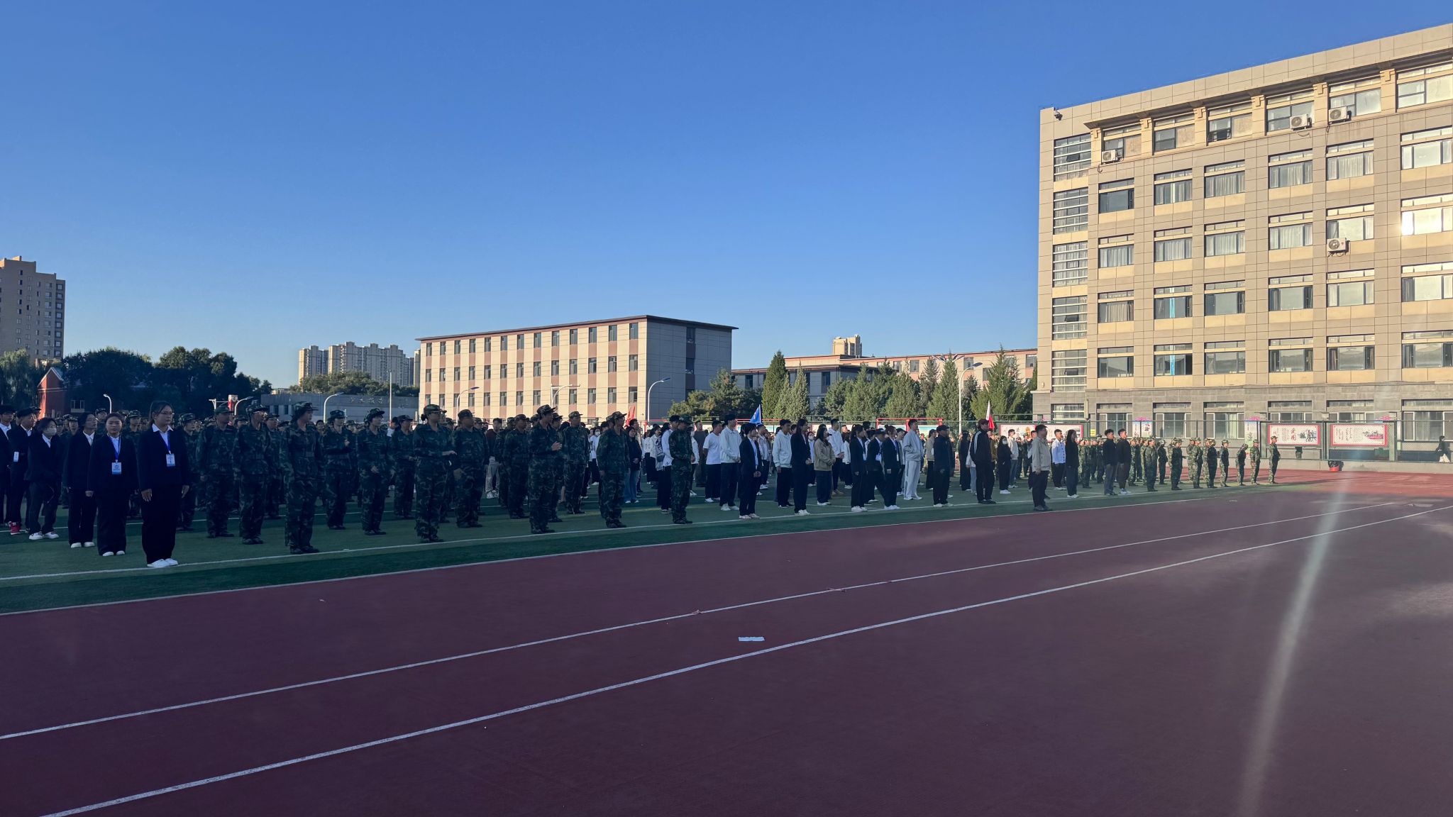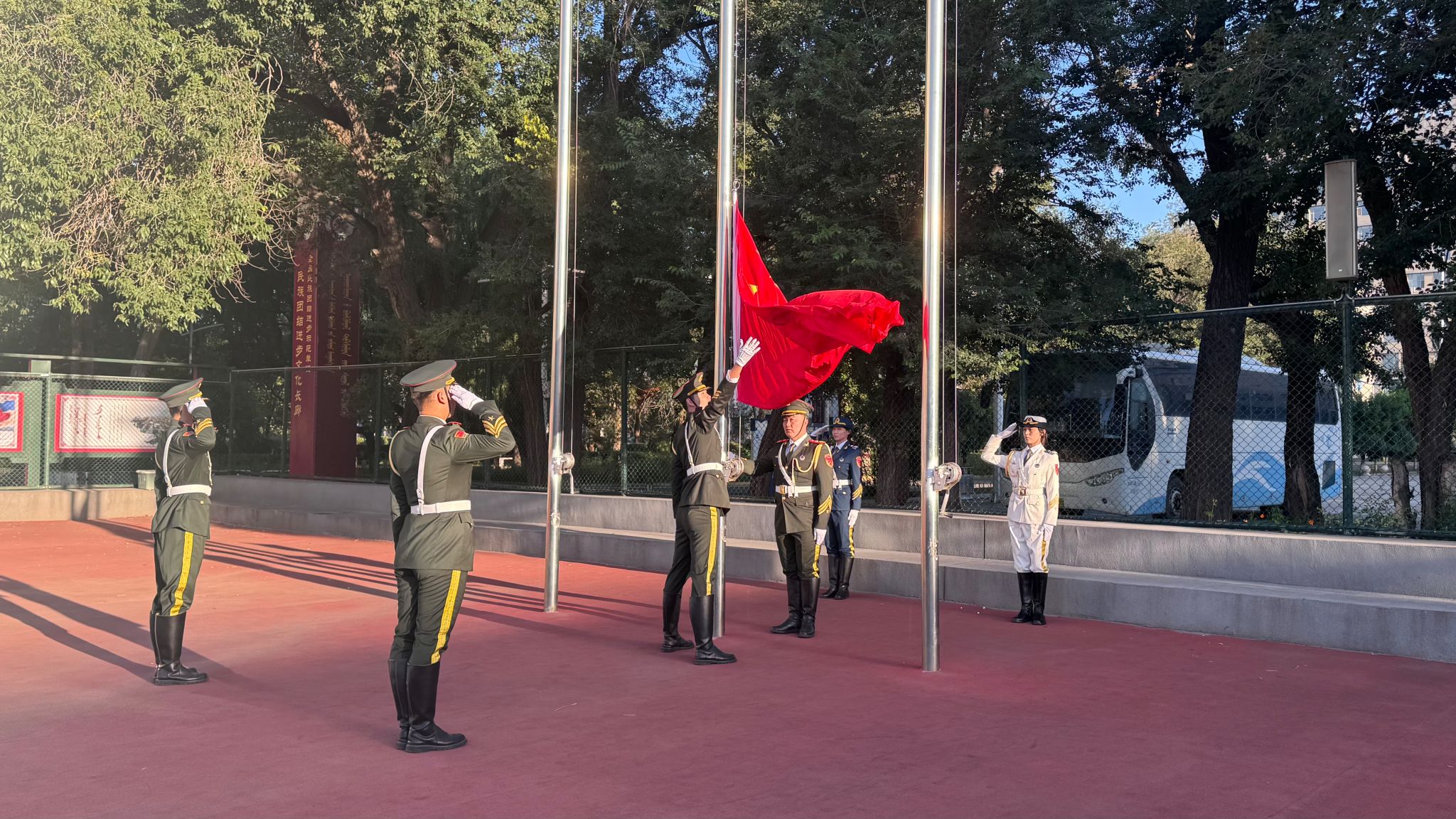 早晨7时升旗仪式正式启动。伴着雄壮的《义勇军进行曲》,五星红旗缓缓升起,全体师生肃立行注目礼,目光紧紧追随迎风展扬的国旗,心中满溢对祖国的无限热爱与崇高敬意。
