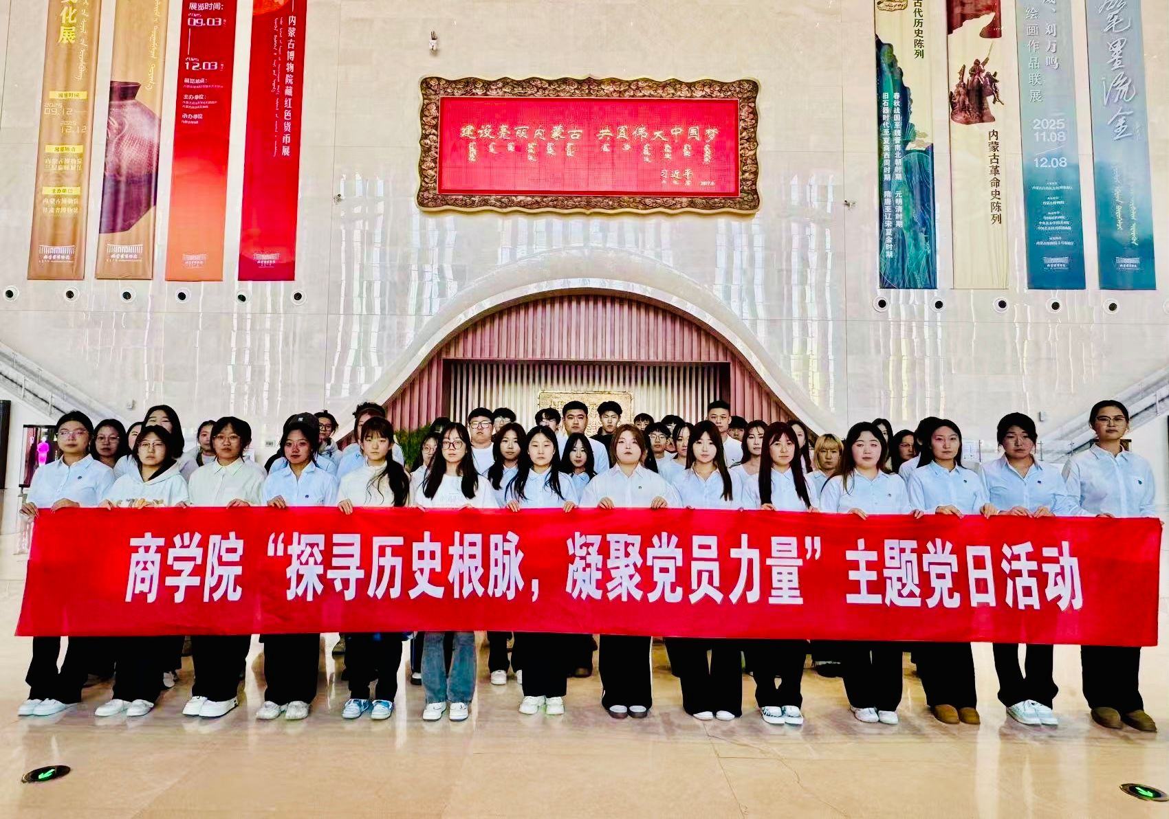 深入贯彻落实中国共产党第二十届中央委员会第四次全体会议以及内蒙古自治区第十一届委员会第十次全体会议精神,为进一步丰富学生的政治生活内涵,大力推进爱国主义教育,积极引导青年学生在实践中深刻体悟历史、坚定文化自信,12月14日,商学院学生党支部“探寻历史根脉,凝聚党员力量”主题党日活动在内蒙古博物院举行。本次活动学院在校党员、发展对象、入党积极分子、团员及学生会成员共计65名学生参与。