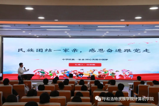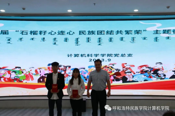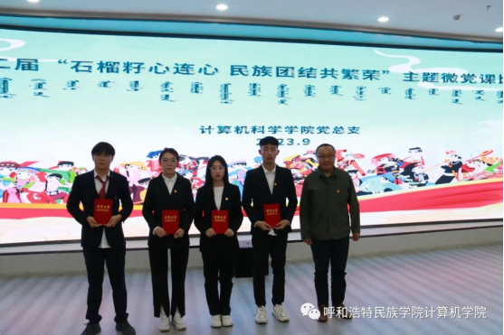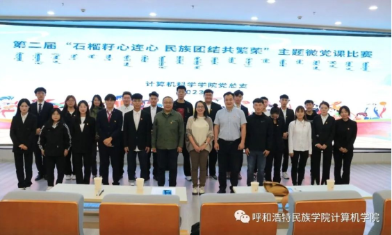 为引导大学生更加由衷地感恩党、听党话、跟党走,不断增强对伟大祖国、中华民族、中华文化、中国共产党、中国特色社会主义的认同,促进各民族在中华民族大家庭中像石榴籽一样紧紧抱在一起,为完成习近平总书记交给内蒙古的五大任务和全方位建设模范自治区凝聚精神力量,进一步教育引导学生党员队伍学好新时代理论,讲好新时代故事。计算机科学学院党总支于9月27日晚在北图书馆一楼报告厅,开展第二届“石榴籽心连心,民族团结共繁荣”主题微党课比赛,出席本次比赛的嘉宾有计算机科学学院党总支书记雪梅、经济管理学院副院长赛希雅拉图、计算机科学学院党总支副书记色登丹巴。