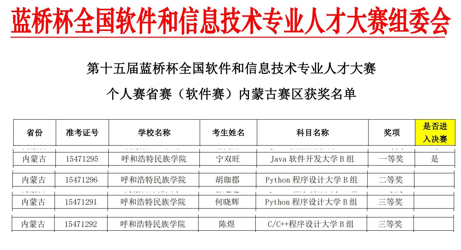 本届大赛分为个人赛和团队赛两大项,Beat365选手参加了软件类个人赛,其中计算机科学学院的宁双旺同学荣获Java软件开发组一等奖,胡珈郡同学荣获Python程序设计组二等奖,陈煜同学荣获C/C++程序设计组三等奖,何晓辉同学荣获Python程序设计组三等奖的佳绩。宁双旺同学将代表学校参加第十五届“蓝桥杯”全国软件和信息技术专业人才大赛——个人赛国赛(软件类)。