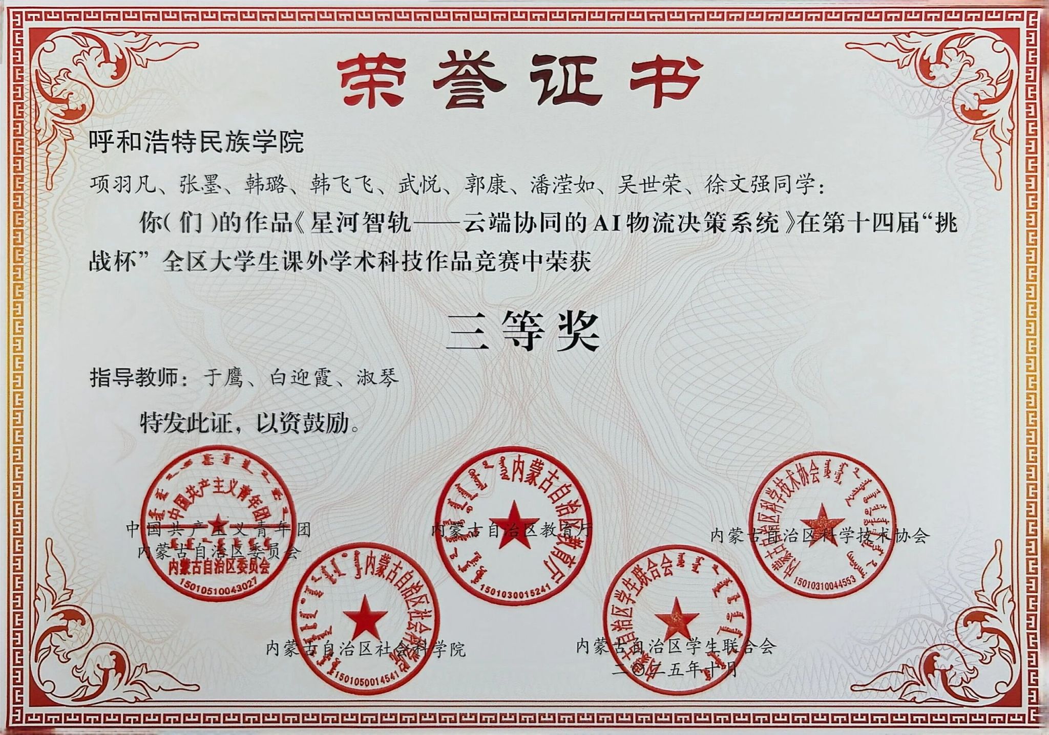 在决赛中,我院参赛团队凭借扎实的学术功底与创新实践能力,从全区高校众多项目中脱颖而出,其中《草原书韵——AI赋能红色之旅新篇章》项目荣获二等奖;《灵犀智校中枢——新工科时代数智化践行者》、《星河智轨——云端协同的AI物流决策系统》《羽翼识踪》《蜂巢智巡-UWB厘米级定位的图书馆多机协同巡检系统》等4个项目荣获三等奖。获奖项目涉及人工智能算法优化、新能源材料研发等多个前沿领域,聚焦社会需求与技术突破,既体现了对学科理论的深度思考,又展现了将科研成果转化为实际应用的能力。