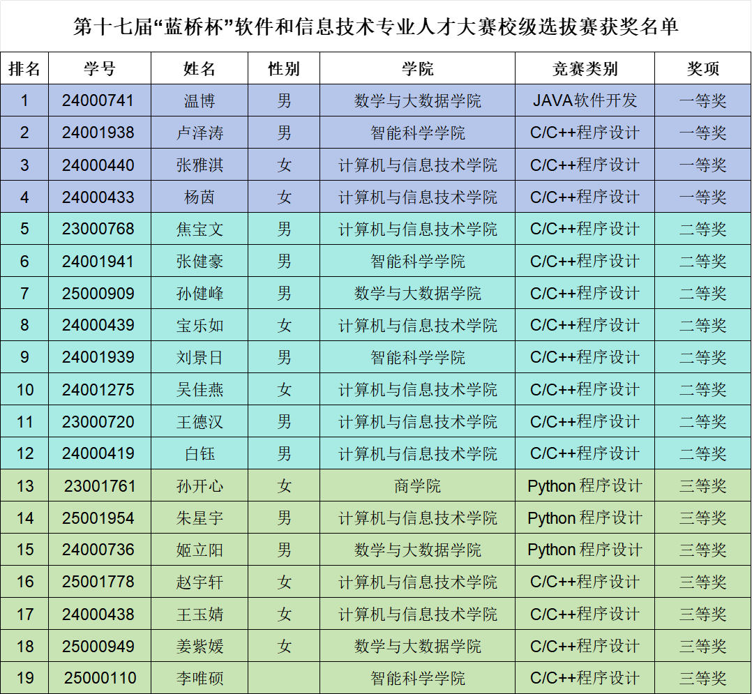 本次比赛涵盖了C/C++、Java、Python三个组别,旨在全方位考察学生的编程能力、算法设计能力及问题解决能力,同时激发学生对软件开发的兴趣,为即将到来的省赛选拔优秀人才。比赛过程中,选手们全神贯注、争分夺秒,充分展现了扎实的专业功底和良好的创新精神。经过三个小时的激烈角逐,最终,温博等4名同学荣获一等奖;焦宝文等8名同学荣获二等奖;孙开心等7名同学荣获三等奖。