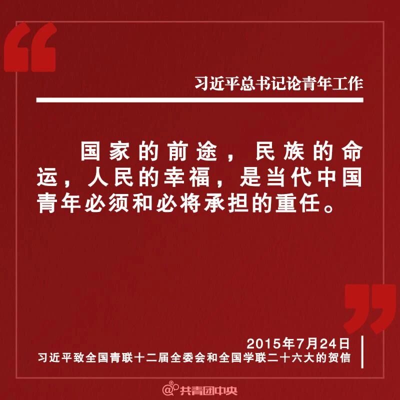 “在革命、建设、改革各个历史时期,中国共产党始终高度重视青年、关怀青年、信任青年,对青年一代寄予殷切期望。中国共产党从来都把青年看作是祖国的未来、民族的希望,从来都把青年作为党和人民事业发展的生力军,从来都支持青年在人民的伟大奋斗中实现自己的人生理想。”2013年5月4日,习近平总书记在同各界优秀青年代表座谈时指出。