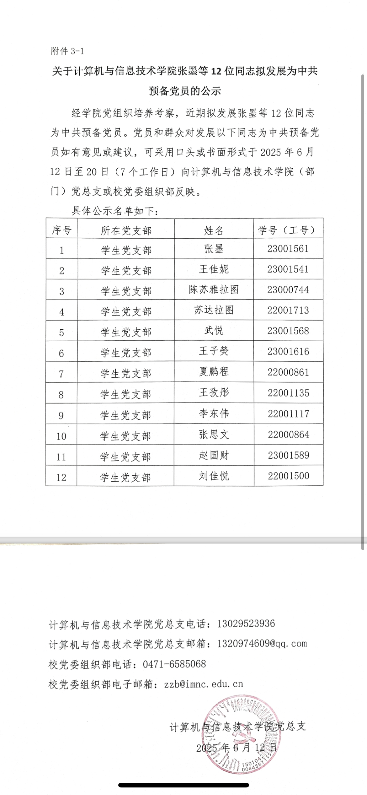 关于计算机与信息技术学院张墨等12位同志拟发展为中共预备党员的公示