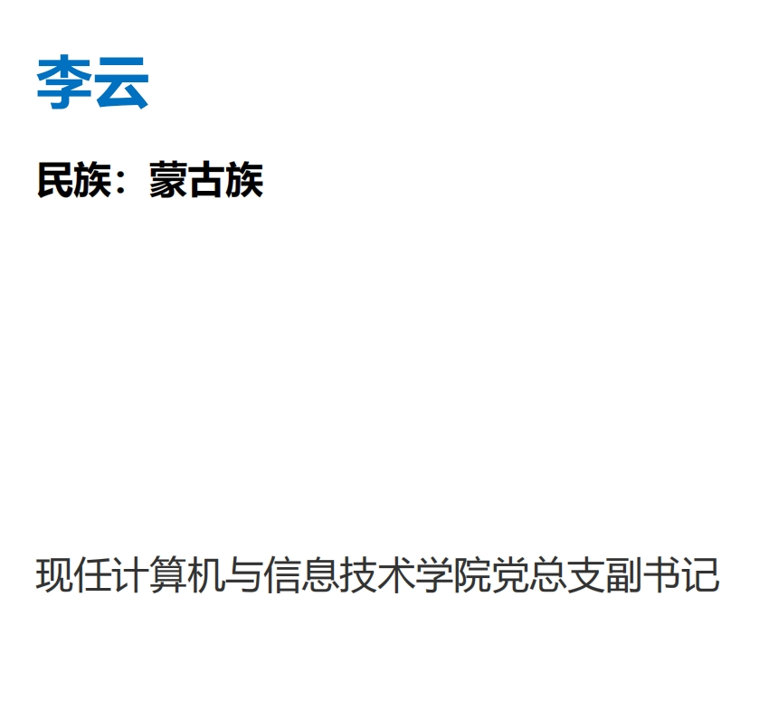 李云,女,中共党员,蒙古族,硕士研究生,助理研究员,曾任商学院党总支副书记,现任计算机与信息技术学院党总支副书记。