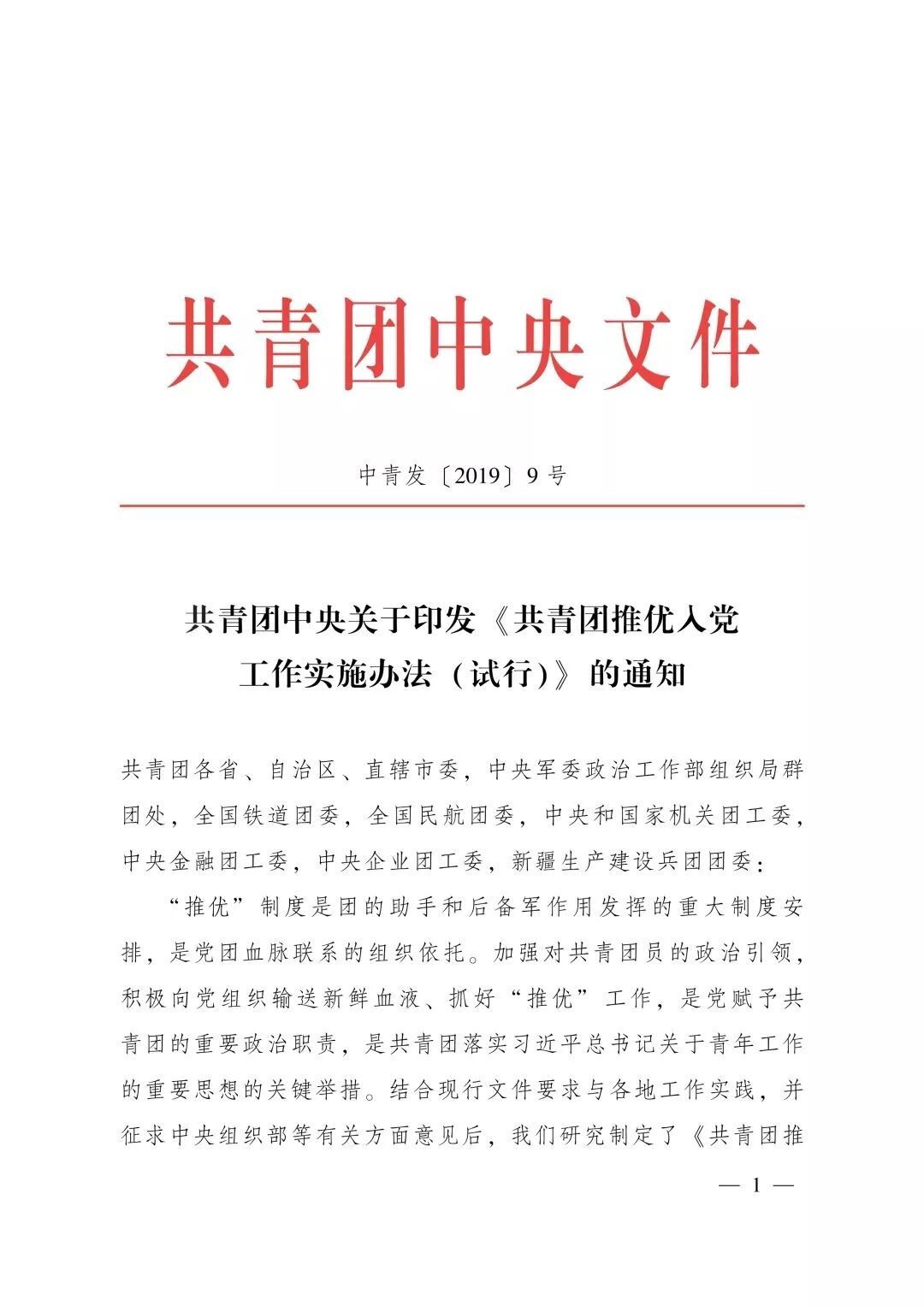 第一条 推荐优秀共青团员作党的发展对象(以下简称“推优”),是党赋予共青团组织的一项光荣任务。为保持和增强共青团的政治性、先进性、群众性,进一步规范和加强共青团“推优”工作,有效提升青年党员质量,根据《中国共产党章程》、《中国共产主义青年团章程》和《中共中央组织部、共青团中央关于进一步做好推荐优秀团员作党的发展对象工作的意见》、《中共中央组织部关于进一步加强在青年中发展党员工作的意见》、《中共中央组织部、共青团中央、国资委党委关于进一步加强和改进中央企业共青团工作的意见》、《中国共产党发展党员工作细则》等,制定本办法。