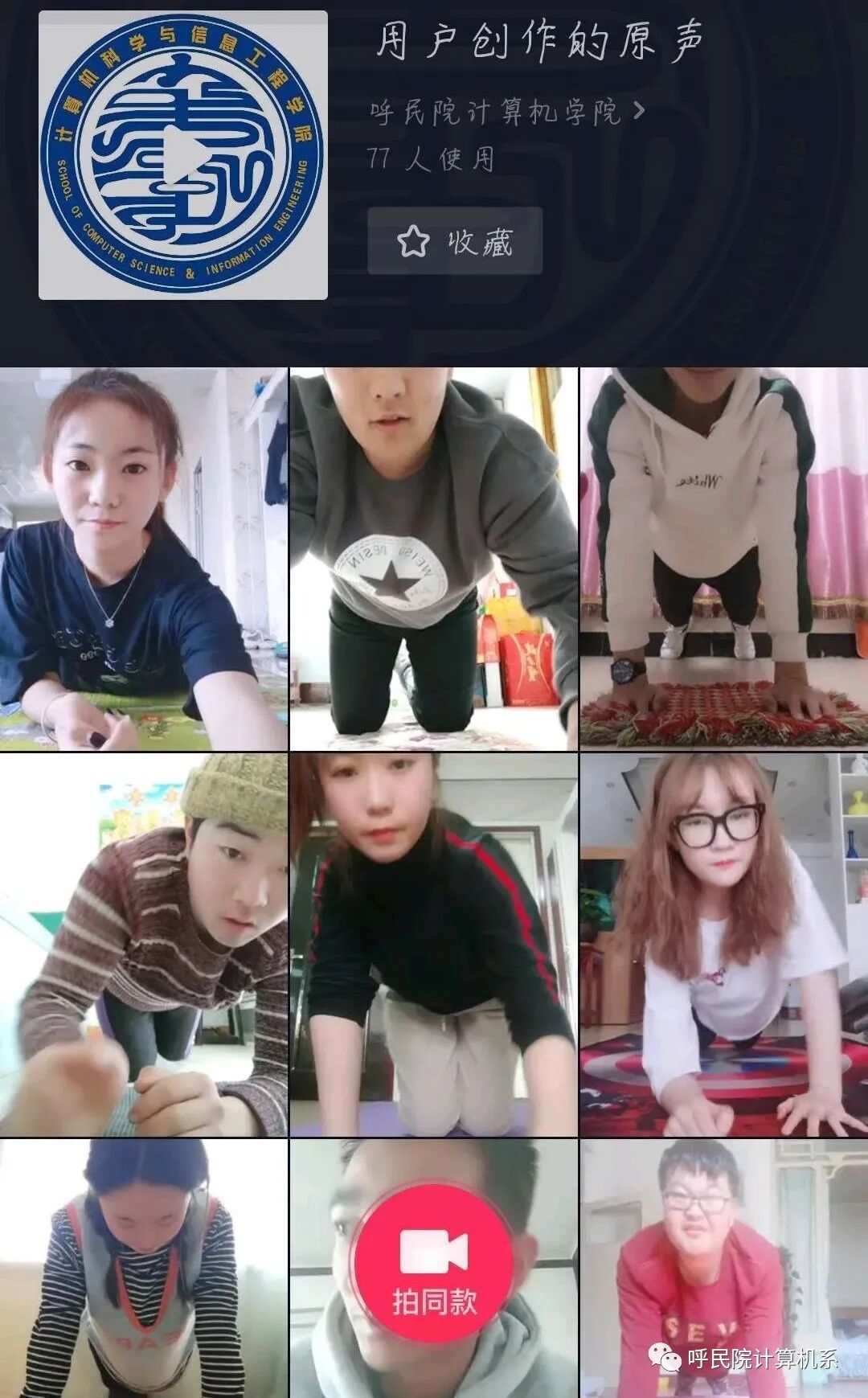与其窝在沙发玩手机,不如来组平板撑。与其躺在床上睡大觉,不如来组俯卧撑。本次活动为学生提供了有趣的居家运动项目-平板撑挑战,有助于引导人们树立科学健身的良好意识。活动开始当天报名参加人数逐步增加,抖音话题播放量也大大提升。宅在家中的同学们通过参加宅运会,积极的传播了运动正能量,增强了抗击疫情的信心。
