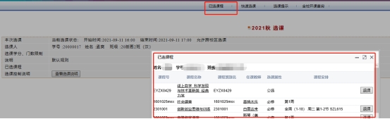 3. 选课完成后需要学生再次确认选课结果(图6),选课结果以“教务管理系统”中的个人课表“已选课程”的结果为准。