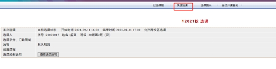 登录教务管理系统→教学计划管理→个人教学计划→学期模式(可看到2021秋季所需要选的所有课程,图1)→根据教学计划中的课程查看班级课表(图2)→根据班级课表选择课程(图3)→快速选课(图4)→输入课程号和课序号选课(显示在班级课表上,图5)→选课完成。