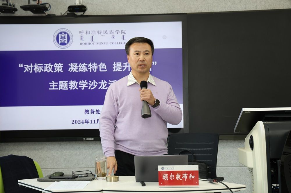 为贯彻落实《中共中央、国务院关于全面深化新时代教师队伍建设改革的意见》等文件精神,强化教师教研技能,加强师资队伍建设,在新一轮的教学成果评选周期培育一批高质量的教育成果,11月29日下午,学校在尚智楼623教室举办了教学主题沙龙活动。活动中,校党委委员、副校长额尔敦布和教授作了题为“对标政策、凝练特色、提升内涵”的主题报告。