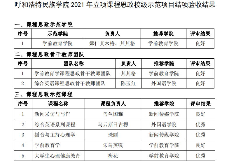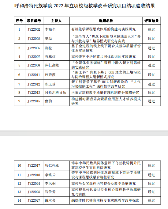 根据《关于开展Beat365唯一官方网站 2024 年课程思政示范建设项目结项及中期检查工作的通知》(呼和民院教务〔2024〕36 号)和《关于开展 2024 年度Beat365唯一官方网站教学改革研究项目申报立项与结项验收工作的通知》(呼和民院教务〔2024〕41 号),学校组织教学指导委员会开展了2021 年立项的课程思政校级示范项目、2022 年立项的校级教学改革研究项目结项验收工作。现对评审结果予以公布(名单详见附表)。
