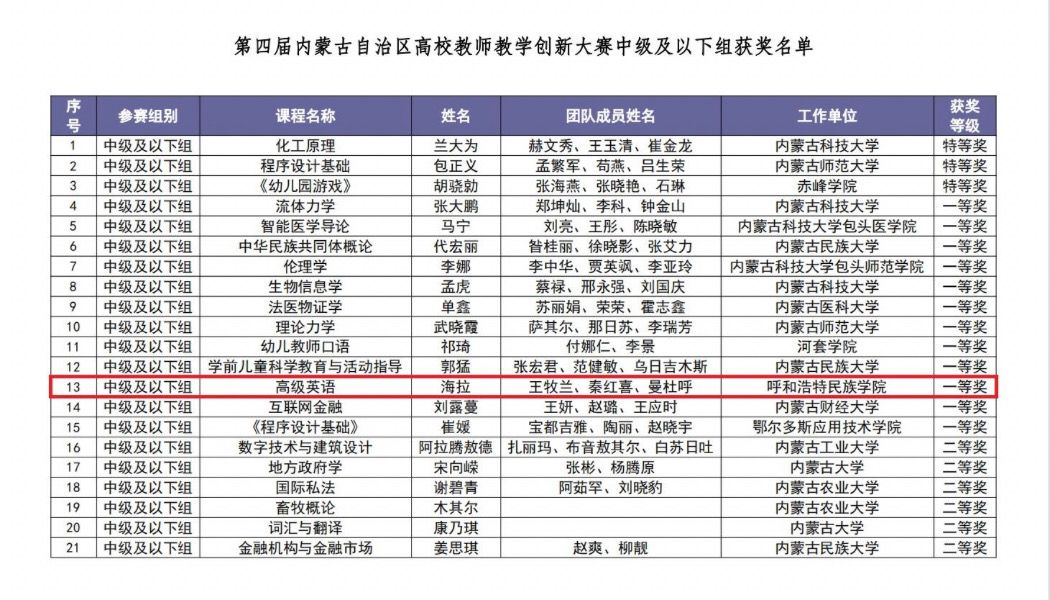 4月12日至13日,由自治区教育厅主办的第四届内蒙古自治区高校教师教学创新大赛暨第四届全国高校教师教学创新大赛内蒙古赛区选拔赛在内蒙古科技大学举办。