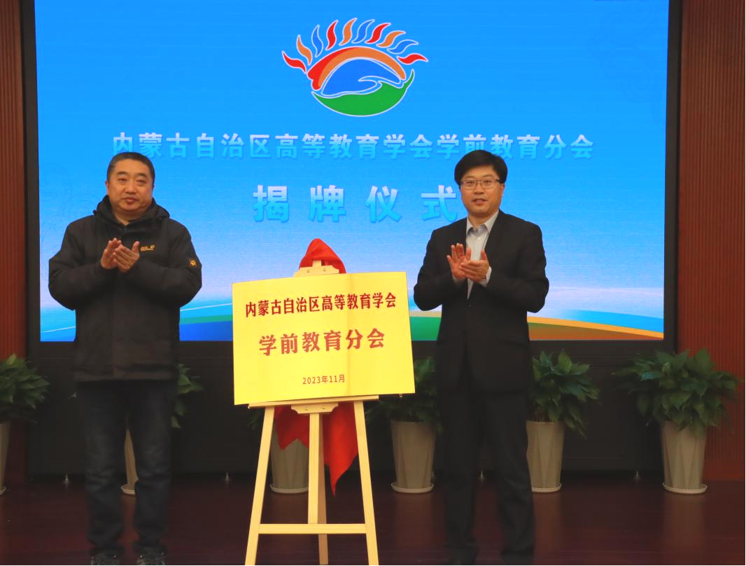 韩伟新和高教学会副秘书长、内蒙古工业大学马克思主义学院党委书记王文华共同为学前教育分会揭牌。中国书画协会副主席彭淼赠送墨宝,学前教育学院党总支书记娜仁其木格接受馈赠。学前教育学院副院长朱乌英嘎宣读《学前教育分会工作规程》,学前教育学院副院长其其格介绍学前教育分会筹备情况。经选举,推选其其格为学前教育分会理事长,内蒙古师范大学教育学院原院长米俊魁为常务副理事长,朱乌英嘎为秘书长。