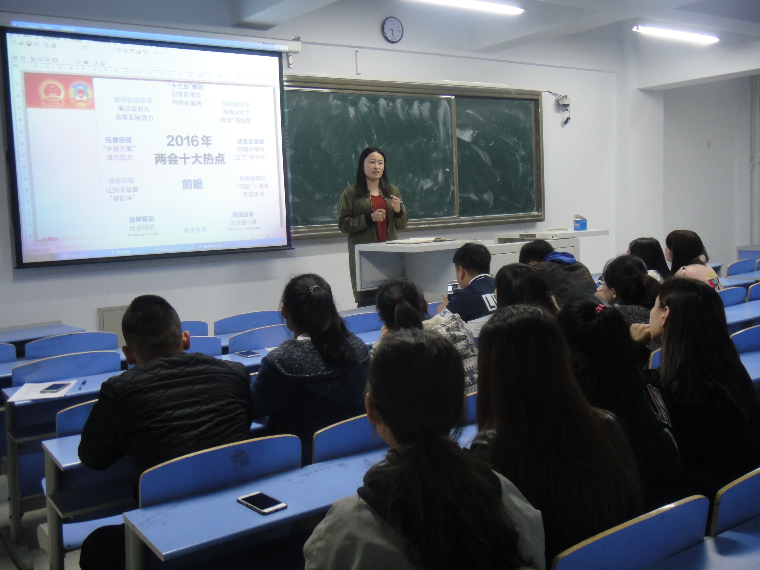 本次学习活动采取了老师重点讲解、学生分享学习心得和自由讨论交流的形式,团总支书记胡宝泉向同学们讲解了今年两会主要内容并作了简要总结,学生党员自身情况围绕大学生就业、反腐倡廉、万众创新、绿色发展等方面分享了学习心得体会,自由交流阶段同学们踊跃发言感想体会,学习活动气氛既轻松又热烈。