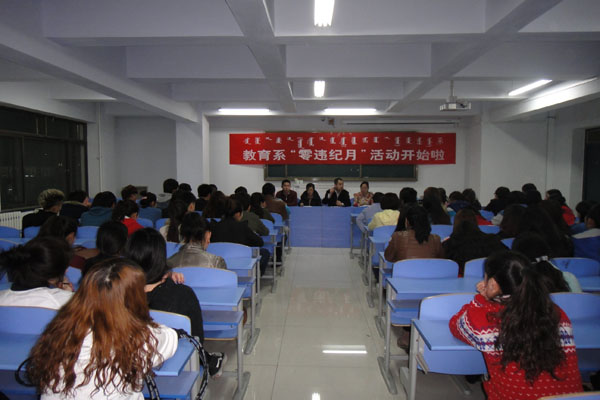 为了加强学生管理工作,于2013年3月14日晚7:30在新教学楼418教室举行了“零违纪月”活动的启动仪式,参加本次活动的有院学生处苏龙高娃老师、苏日高格老师,教育系胡宝泉老师、许晓芳老师、王慧东老师及全体学生。 在本次活动的仪式上,我系团总支书记胡宝泉老师向在场的师生,详细说明了本次活动的目的、教育内容及活动要求并宣读了教育系“零违纪月”活动的方案。之后,许晓芳老师、王慧东老师组织各自班级的学生深入学习了学院有关规章制度。