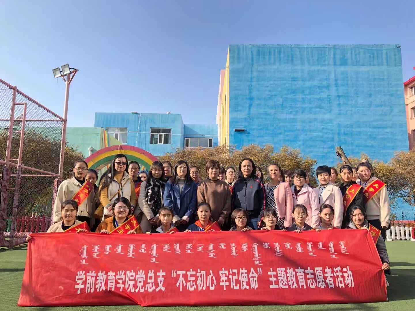 在“不忘初心、牢记使命”主题教育活动开展之际,11月8日上午10时学前教育学院党总支书记娜仁其木格带领教师党员和学生到新城区第一幼儿园开展志愿者服务活动。