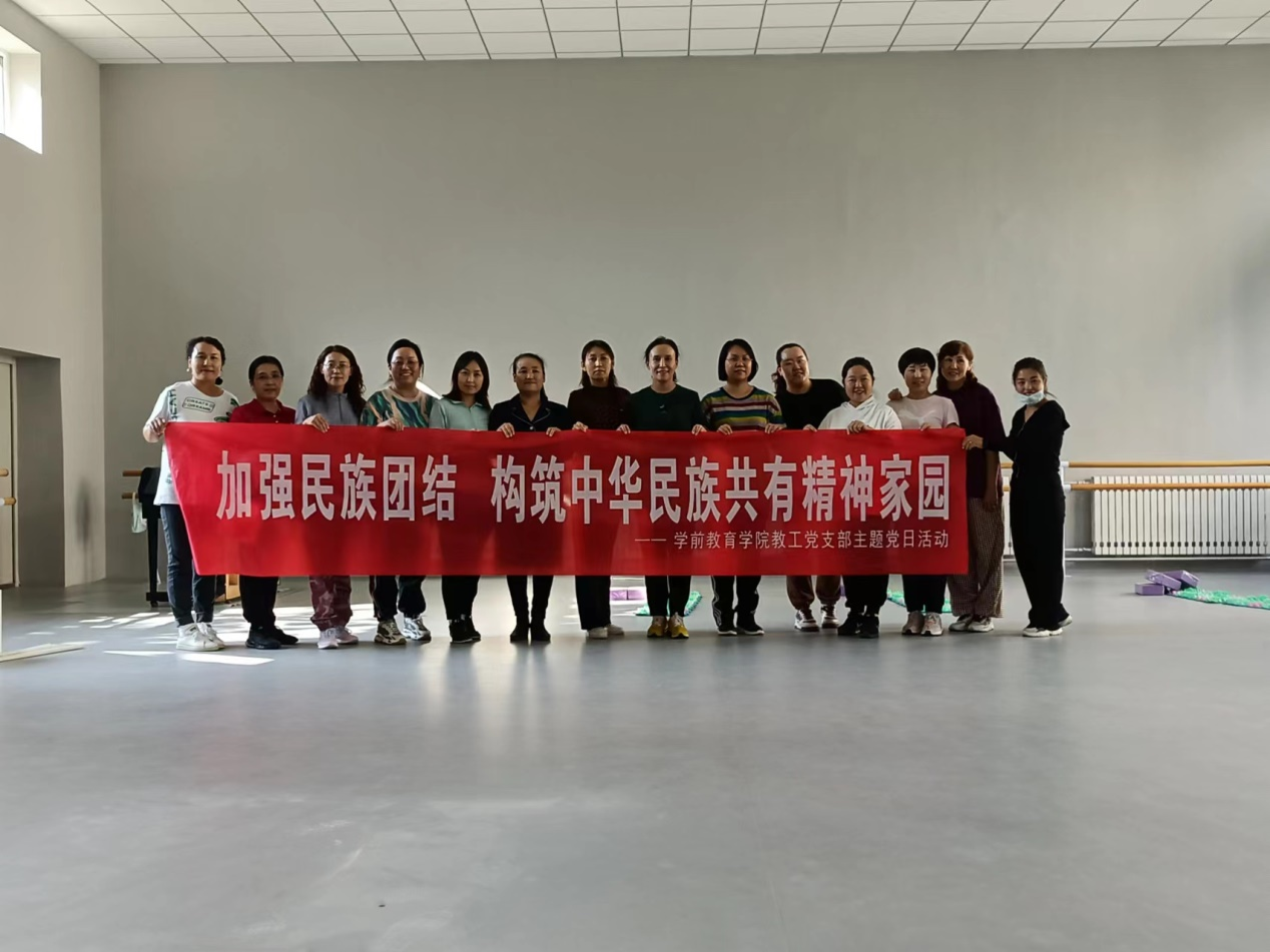 为认真贯彻落实习近平总书记关于加强和改进民族工作的重要思想,全面深入开展民族团结进步工作,引导全院教师牢固树立“三个离不开”和“五个认同”,9月8日,学前教育学院教工党支部在沃德楼舞蹈教室开展了“加强民族团结,构筑中华民族共有精神家园”主题党日活动。
