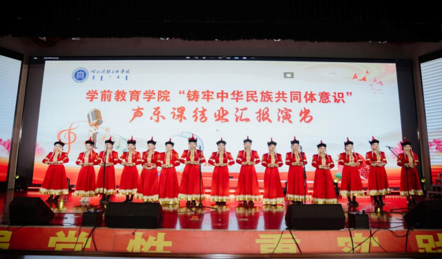为进一步贯彻落实习近平总书记关于加强和改进民族工作的重要思想,深化我院民族团结进步工作,加强我院师生铸牢中华民族共同体意识教育,学前教育学院2024年6月13日晚19:00时在北图书馆二楼报告厅举办了铸牢中华民族共同体意识主题2021级声乐课结业汇报演出。学前教育学院副院长其其格、新城区第一幼儿园园长计爽,呼和浩特蒙古族第二幼儿园园长乌日勒格以及各二级学院师生共500余人一同观演。本次活动由学前教育学院主办,任课教师萨日胡、梁秀梅老师组织演出。