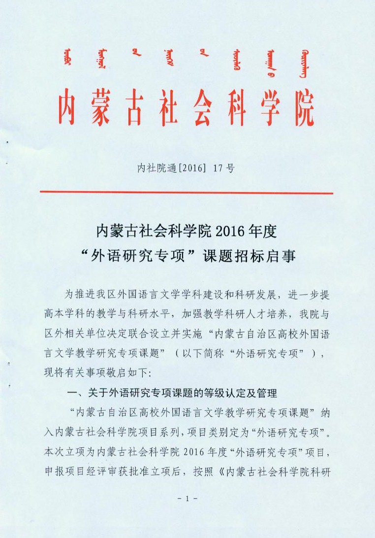上一条: 转发关于组织申报“内蒙古社会科学研究课题” 2016年度招标课题的通知