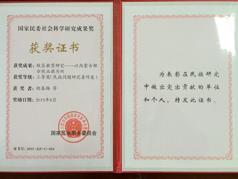 近日,国家民委关于第三届民族问题研究优秀成果奖评选结果揭晓,学院党委副书记胡春梅教授等完成的著作《牧区教育研究——以内蒙古部分牧业旗为例》荣获著作类三等奖。该书探讨了在当今社会结构变革与经济体制转型时期,内蒙古牧区教育发生了何等变化、出现了何种问题、如何进一步繁荣发展的问题,是胡春梅教授主持完成的2009年度自治区高等学校科学技术研究项目“城镇化进程中的牧区教育研究”(编号:NJ09194)成果为基础而著成。