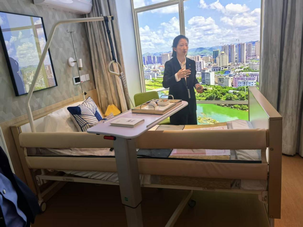 在两所养老机构负责人的热情引导下,离退休人员工作处工作人员先后参观了养老公寓的居住房间、书画室、棋牌室、合唱室、演奏室、电影院、心理咨询师、餐厅以及康复中心等区域。温馨舒适的居住环境、完善的适老化设施、丰富多样的文娱活动场所,给我们留下了深刻印象。特别是在康复护理、健康管理方面的专业设备与科学流程,让大家看到了养老服务的精细化与专业化。