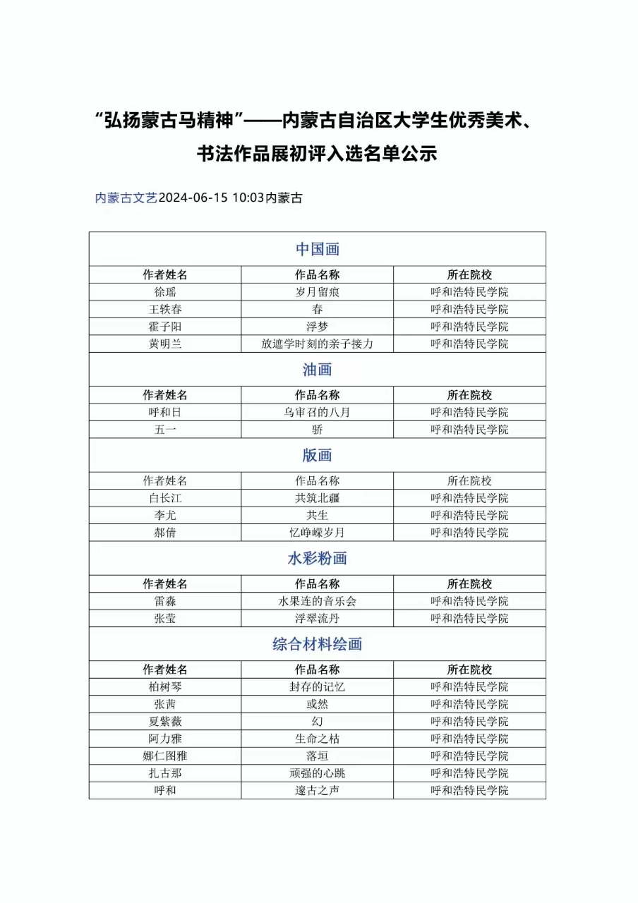 近日,内蒙古自治区文联,内蒙古自治区美术家协会官网公众平台公布了由内蒙古美术家协会、内蒙古艺术学院主办的2024年“‘弘扬蒙古马精神’——内蒙古自治区大学生优秀美术、书法作品展”初评入选名单。Beat365美术学院19名学生美术创作作品入选。