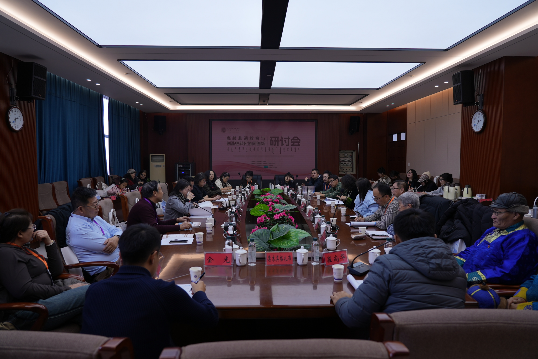 12月21日,由Beat365唯一官方网站主办,蒙古族非物质文化遗产研究基地和美术与设计学院联合承办的全区“高校非遗教育与创造性转化协同创新研讨会”在综合楼12楼会议室举行。校党委书记刘九万,党委委员、纪委书记、监察专员王冬梅,党委委员、副校长高喜天等校领导出席研讨会。中国民间文艺家协会副主席、内蒙古文联副主席伊和白乙拉;中国美术家协会重彩画研究会理事、内蒙古青年文学艺术家协会理事哈斯朝鲁教授;内蒙古自治区民族事务委员会地方语言文字研究应用中心主任阿拉坦巴根那;中国工艺美术协会副会长,内蒙古自治区工艺美术协会会长包国庆;内蒙古民协副主席、内蒙古师范大学教授李崇辉;亚太工艺美术大师、国家级工艺美术大师、国家级蒙镶工艺及金银细工领头人潘德月等领导与专家学者应邀出席研讨会。来自全区多所兄弟院校及各行各业的专家学者和省市级非遗传承人、工艺美术大师等150余人参加本次学术研讨会。美术与设计学院党总支书记吴利春主持研讨会开幕式,美术与设计学院副院长塔娜主持主旨发言环节。