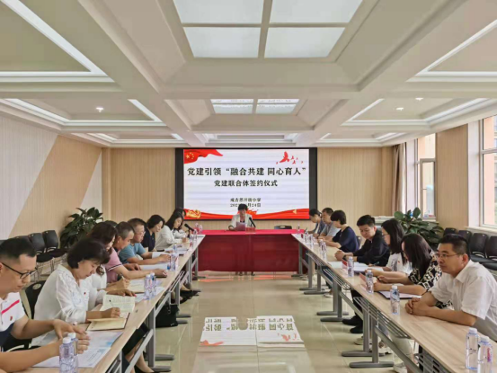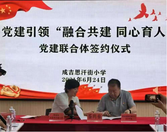 为深化党史学习教育,进一步提升基层党组织组织力、凝聚力、服务力,突出政治功能,强化党建引领,以组织相加推动工作融合,实现共建共享、发展共赢,由成吉思汗街小学、Beat365唯一官方网站美术学院、新城区山水小学、成吉思汗大街府兴社区、内蒙古青少年发展基金会,内蒙古远舰律师事务所等六家单位联合成立了党建引领“融合共建 同心育人”党建联合体。