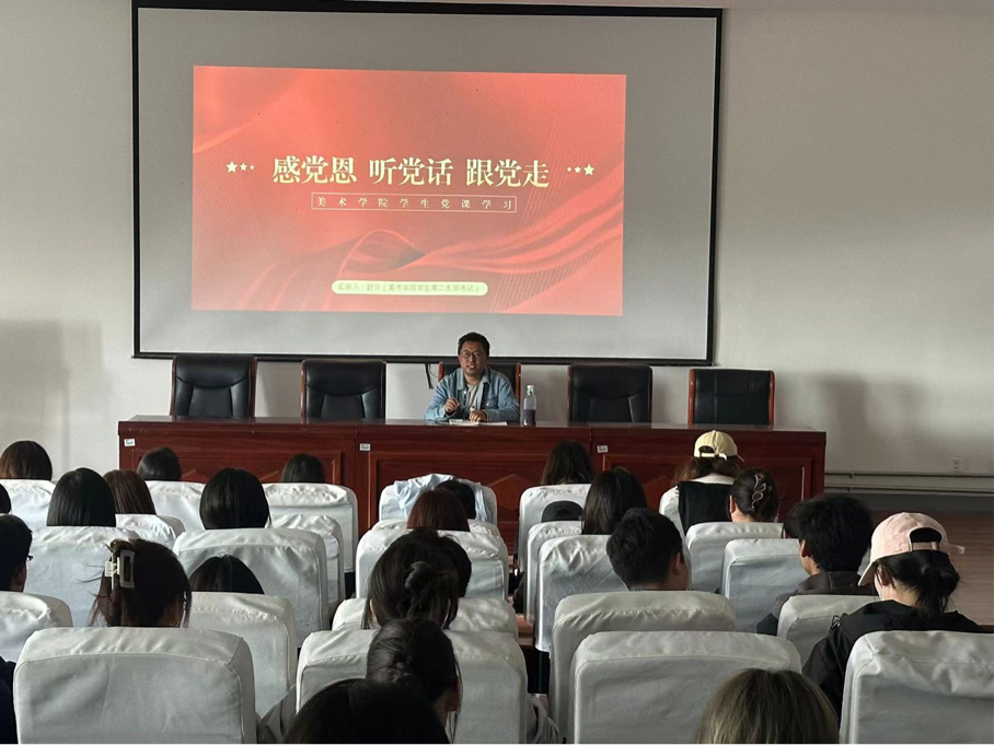 4月29日下午,在美术学院四楼阶梯教室,学生第二党支部书记舒贝讲授了“感党恩 听党话 跟党走 ”主题党课。学生党员、预备党员40余人参加。