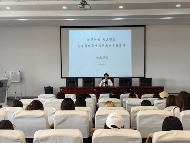 为进一步提升学生行为规范,促进学生行为准则,4月18日,美术学院在美术楼4楼多媒体教室举办了“规范行为 树立形象”为主题的高等学校学生行为准则专题学习。学习由辅导员吴丰林老师主持。学院党总支书记吴利春、各年级班委、宿舍长参加学习。