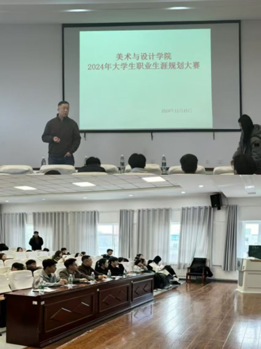 为进一步引导大学生正确认识自己的个性特质,发掘自我潜能,更好地帮助其树立正确的职业生涯目标,11 月 25 日,美术与设计学院在美术楼 407多媒体教室举办了2024年大学生职业规划大赛。大赛评委由学院团总支书记魏伟、辅导员吴丰林、青亮担任。参赛选手、学生代表70余人参加活动。