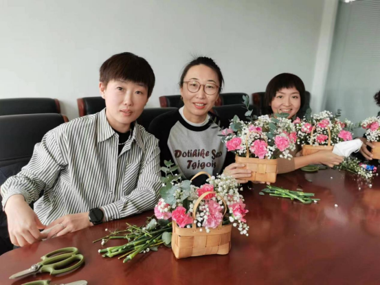 活动中,在花艺师的指导下,大家发挥自己的想象,用灵巧的双手,将康乃馨、满天星、尤加利等多种花材,修剪、整枝,再根据不同的色彩、形状有层次的搭配在一起,制作出了一盆盆形态各异、娇艳欲滴,象征着祝福与美好的插花作品。活动在轻松愉快的氛围中进行。