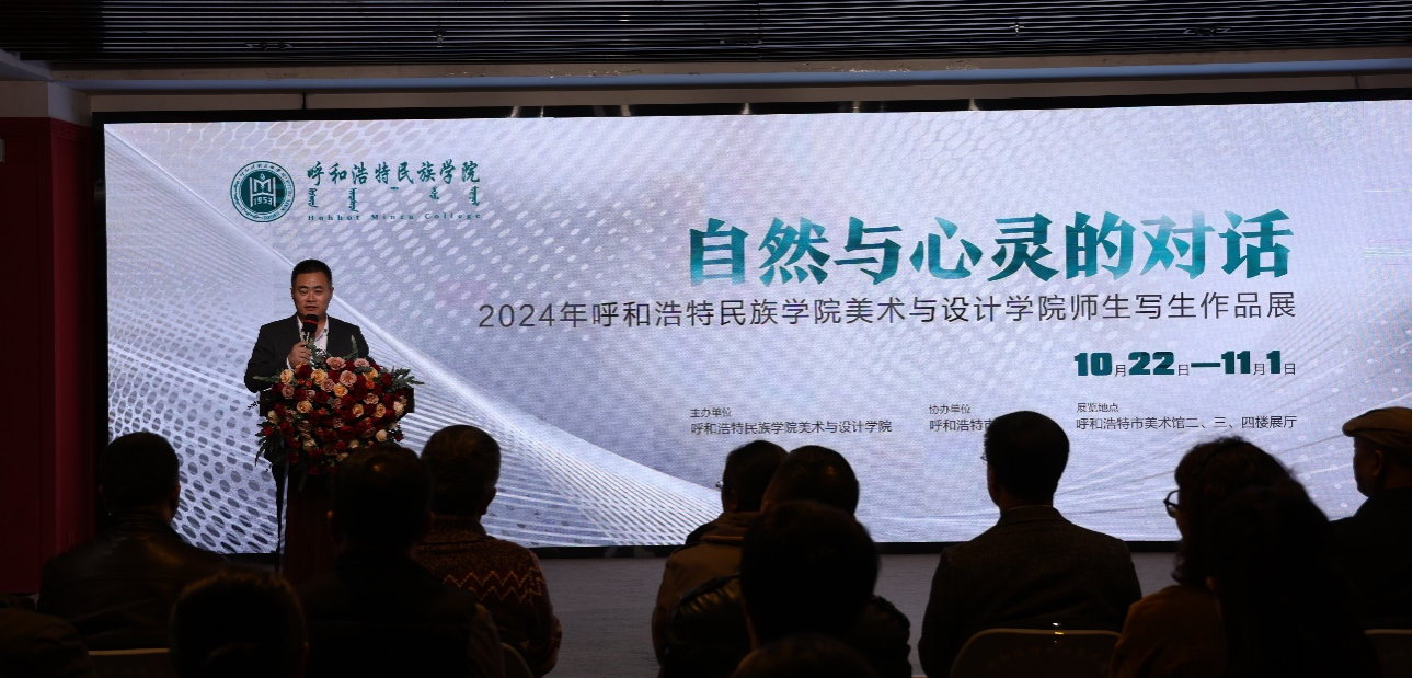 开幕式上,学校党委委员、副校长额尔敦布和教授作致辞。他首先对呼和浩特市美术馆给予学院的大力支持表示感谢,并高度肯定赞扬了此次展览的艺术水准。他指出,写生创作是艺术教学的重要组成部分,是培养学生观察能力和创造力的有效途径。他希望美术与设计学院继续保持锐意进取的精神,深入推进教育教学改革,特别是在写生创作和艺术实践中,不断探索新的教学模式,激发学生的创造力和艺术潜力。同时强调并要求,美术与设计学院要始终坚守文化使命,注重培养学生的民族文化自信,为推动艺术教育事业的高质量发展做出更大贡献。