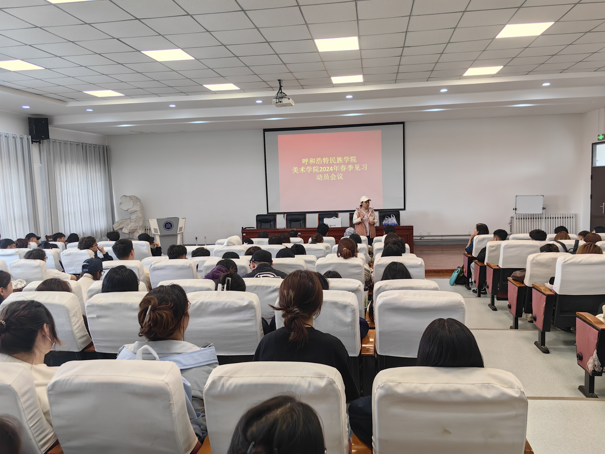 4月7日,美术学院在美术楼四楼阶梯教室召开了2024年春季学期教育见习工作动员大会。美术学院副院长塔娜,教研办副主任白萧天,2021级、2022级美术学专业指导教师和全体学生参加。会议由副院长塔娜主持。