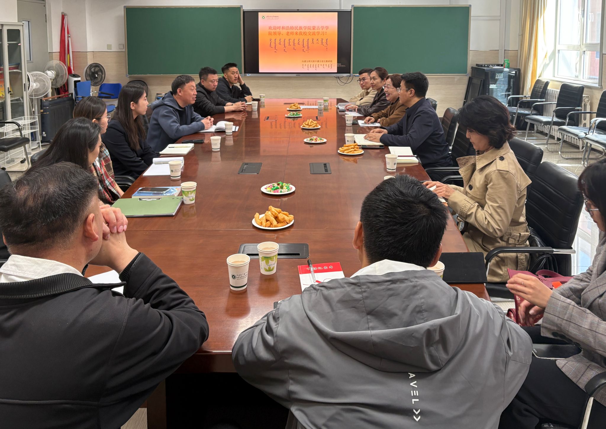 内蒙古师范大学附属中学对此次调研高度重视,副校长额尔敦巴雅尔,教学与教务管理中心副主任赵永胜,安全管理中心负责人格日勒朝克图等领导以及该校蒙古语文教研组全体教师参与座谈。双方围绕中学蒙古语文教学的最新实践、师资能力需求、课程设置衔接等核心议题展开深入探讨,为完善专业培养方案、提升人才培养质量积累了宝贵的一线反馈。