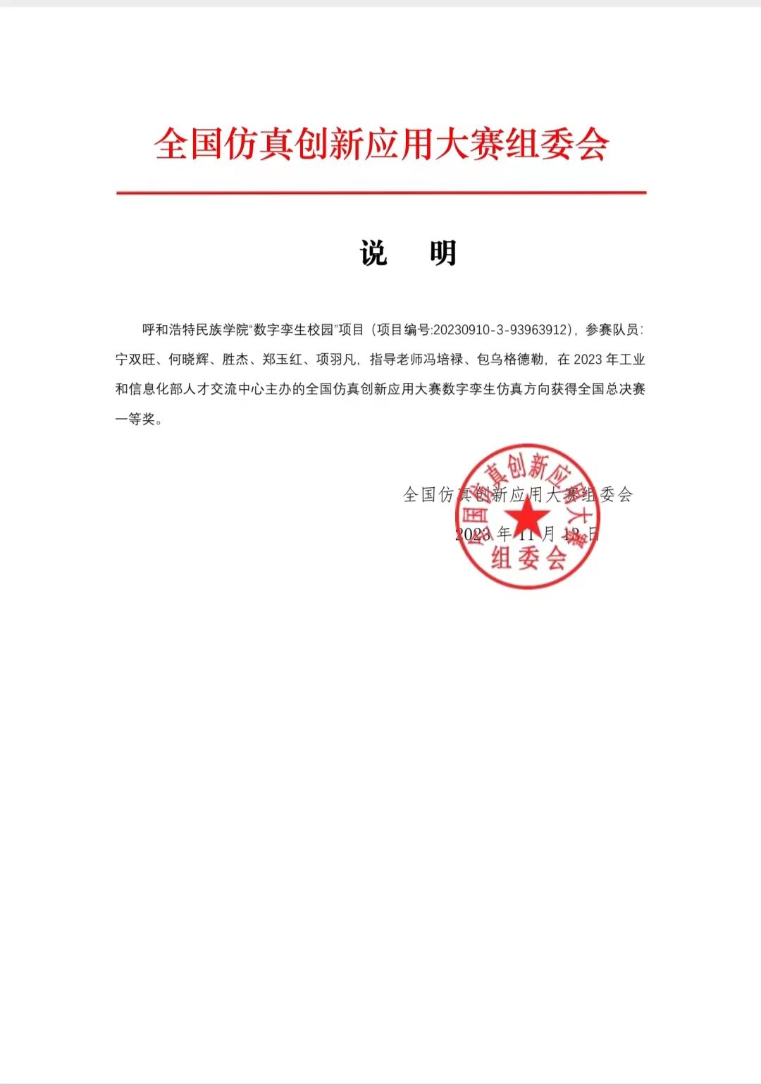 11月13日,由Beat365计算机科学学院教师冯培禄、包乌格德勒指导,宁双旺、何晓辉、胜杰、郑玉红、项羽凡五位同学组成参赛队的《数字孪生校园》项目(项目编号:20230910-3-93963912)在2023年工业和信息化部人才交流中心主办的全国仿真创新大赛数字孪生仿真方向获得全国总决赛一等奖。