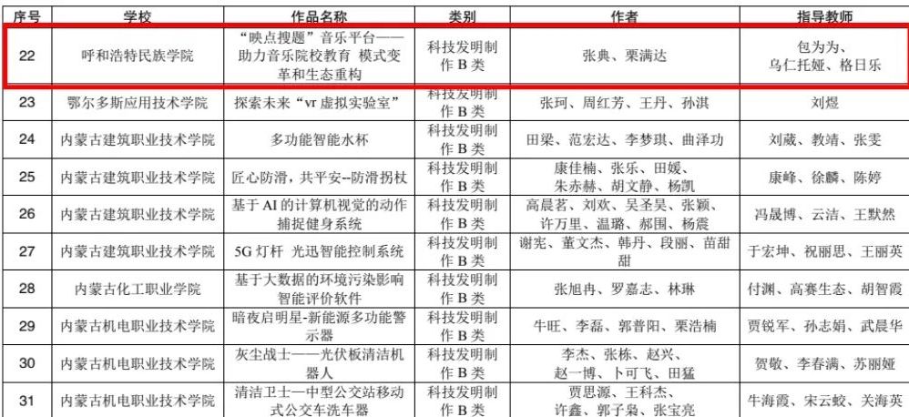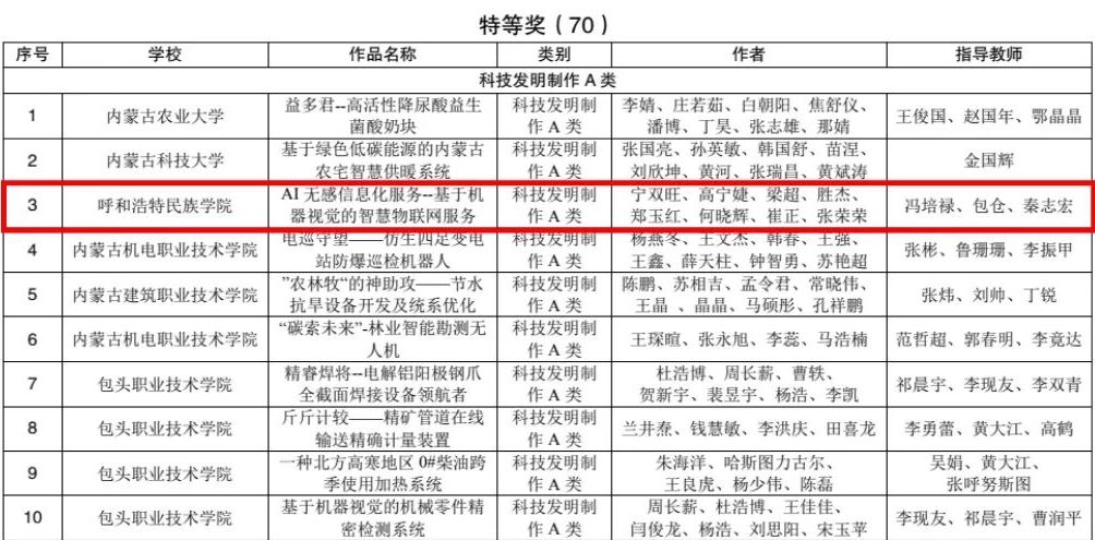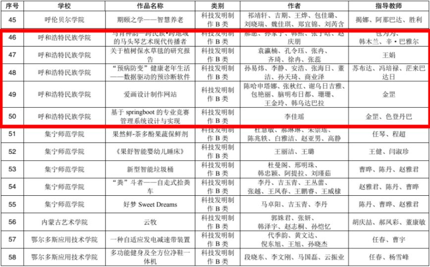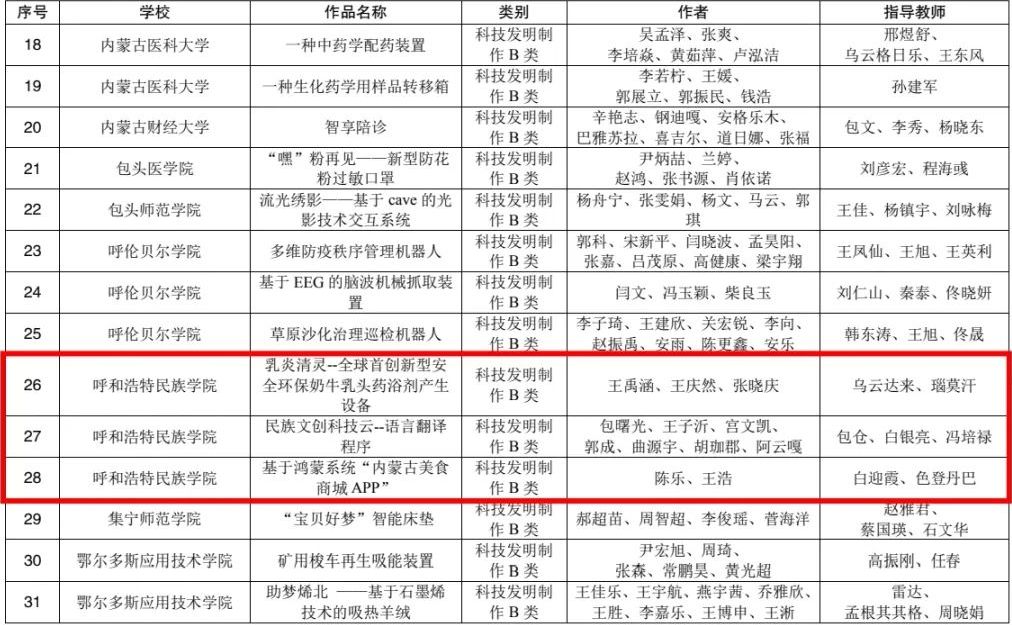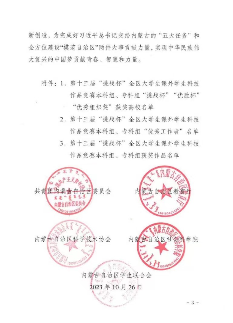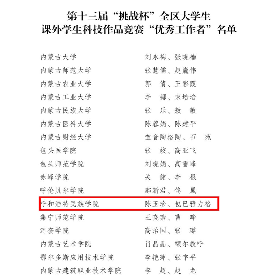 近日,内蒙古自治区第十三届“挑战杯”全区大学生课外学术科技作品竞赛获奖名单公布。Beat365经学院推荐、专家现场评审,最终选送40份作品参加省赛,34份作品获奖,其中,本科组特等奖2项、一等奖2项、二等奖5项、三等奖25项。学校荣获“优秀组织奖”,2名老师获“优秀工作者”荣誉称号。