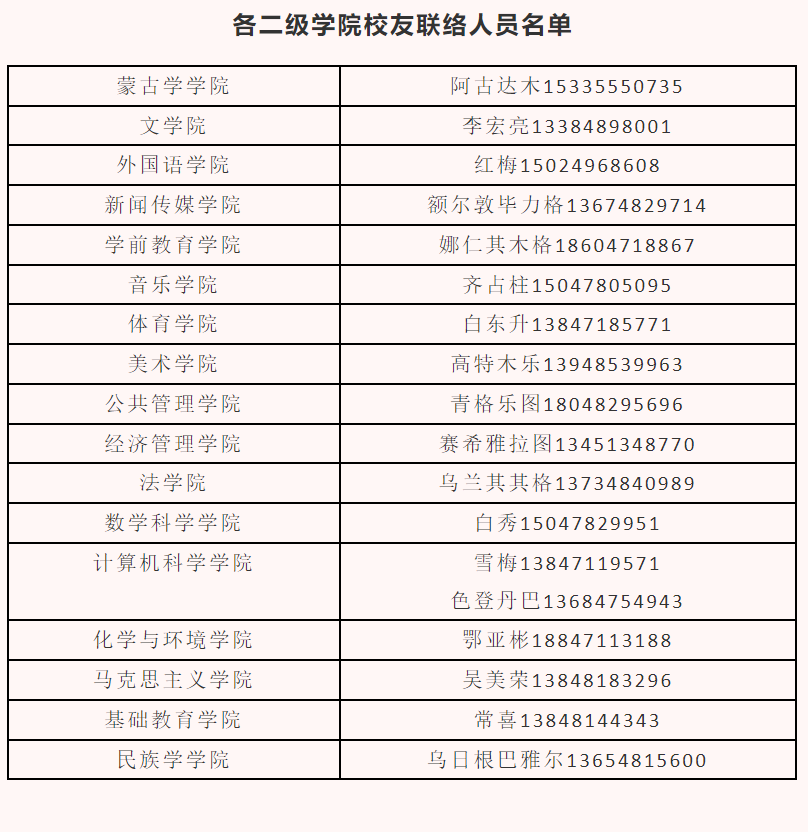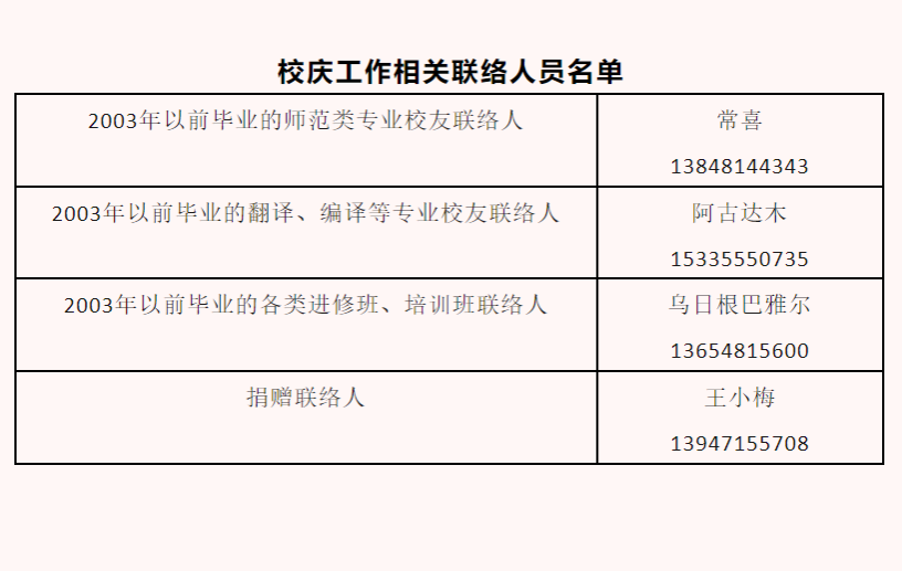 为进一步做好校友联络、捐赠等工作,现公布学校校庆工作相关联络人名单。