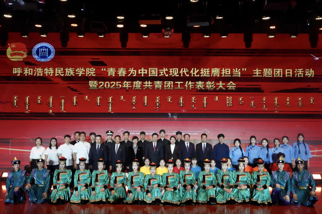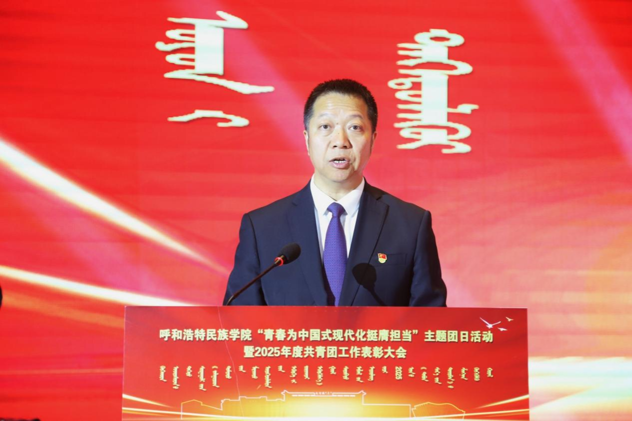 4月28日,学校举办“青春为中国式现代化挺膺担当”主题团日活动暨2025年度共青团工作表彰大会。校党委书记刘九万,党委副书记、校长王敏,党委副书记格根哈斯,党委委员、副校长高喜天,党委委员、副校长刘瑞鸿,党委委员、副校长额尔敦布和,党委委员、副校长双虎出席活动并为获奖单位及个人颁奖。各部门、各学院负责人,各学院党团总支书记、辅导员,获奖师生及学生代表共670余人参会。