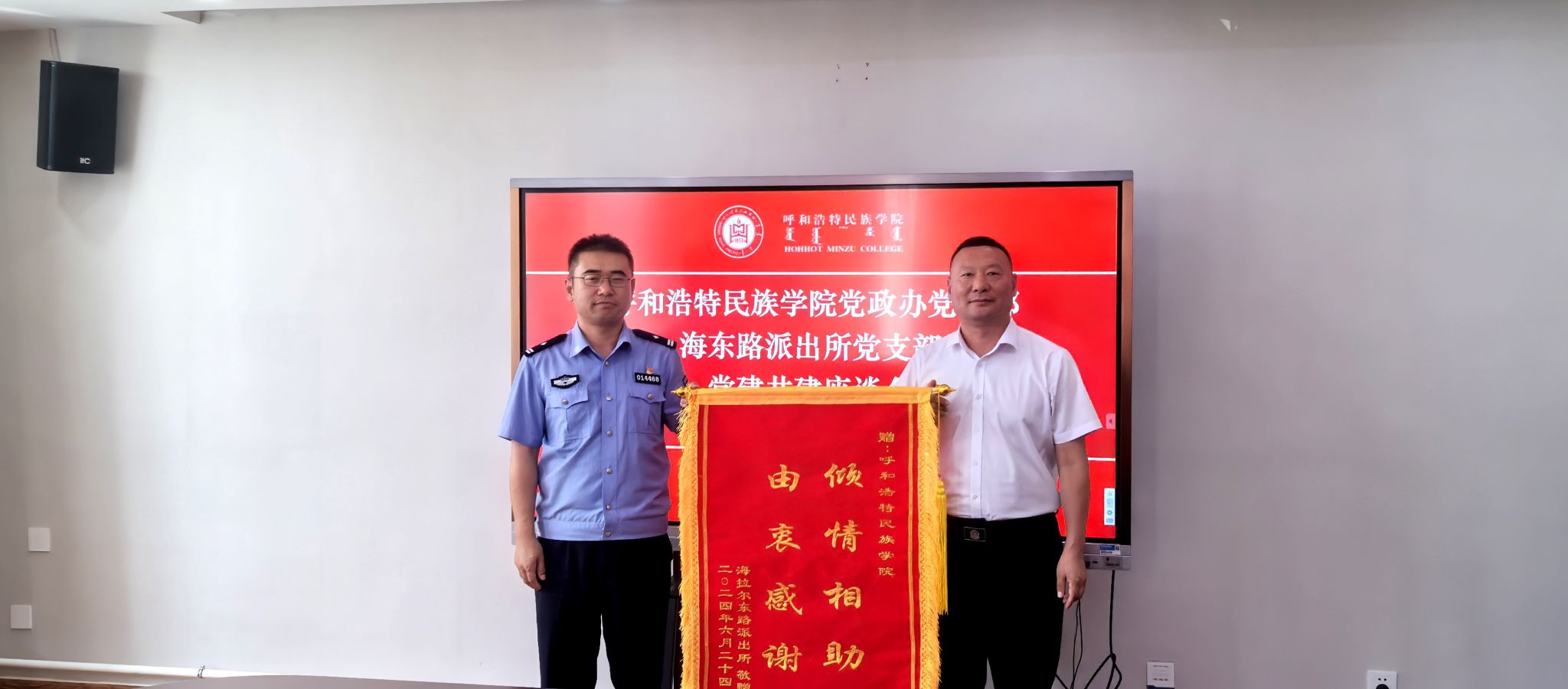 会上,海东路派出所所长、党支部书记赵志飞一行向学校赠送“由衷感谢,倾情相助”的锦旗。