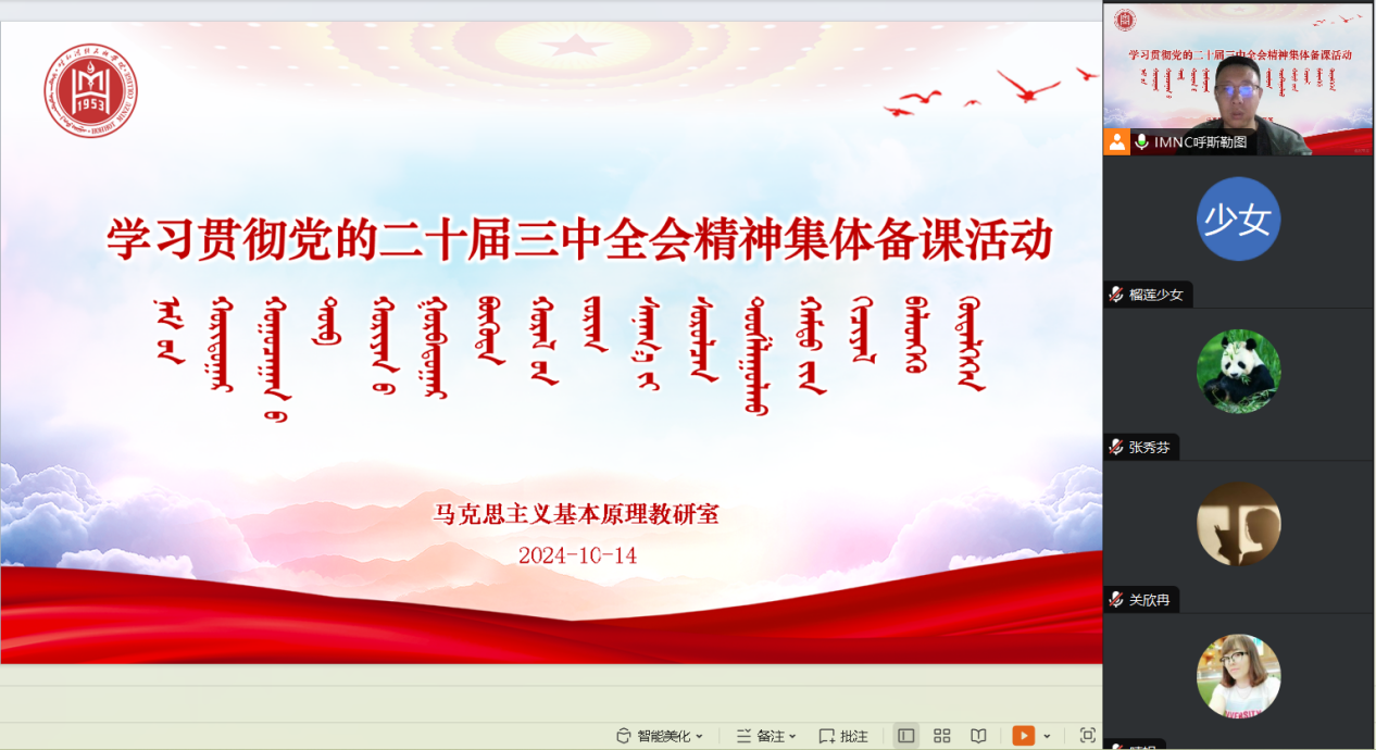 10月14日,马原理教研开展“学习贯彻党的二十届三中全会精神集体备课活动”,此次备课会由教研室全体教师参加,重点讨论如何将全会精神与马克思主义基本原理相结合,引导学生深刻认识全面深化改革的重大意义。