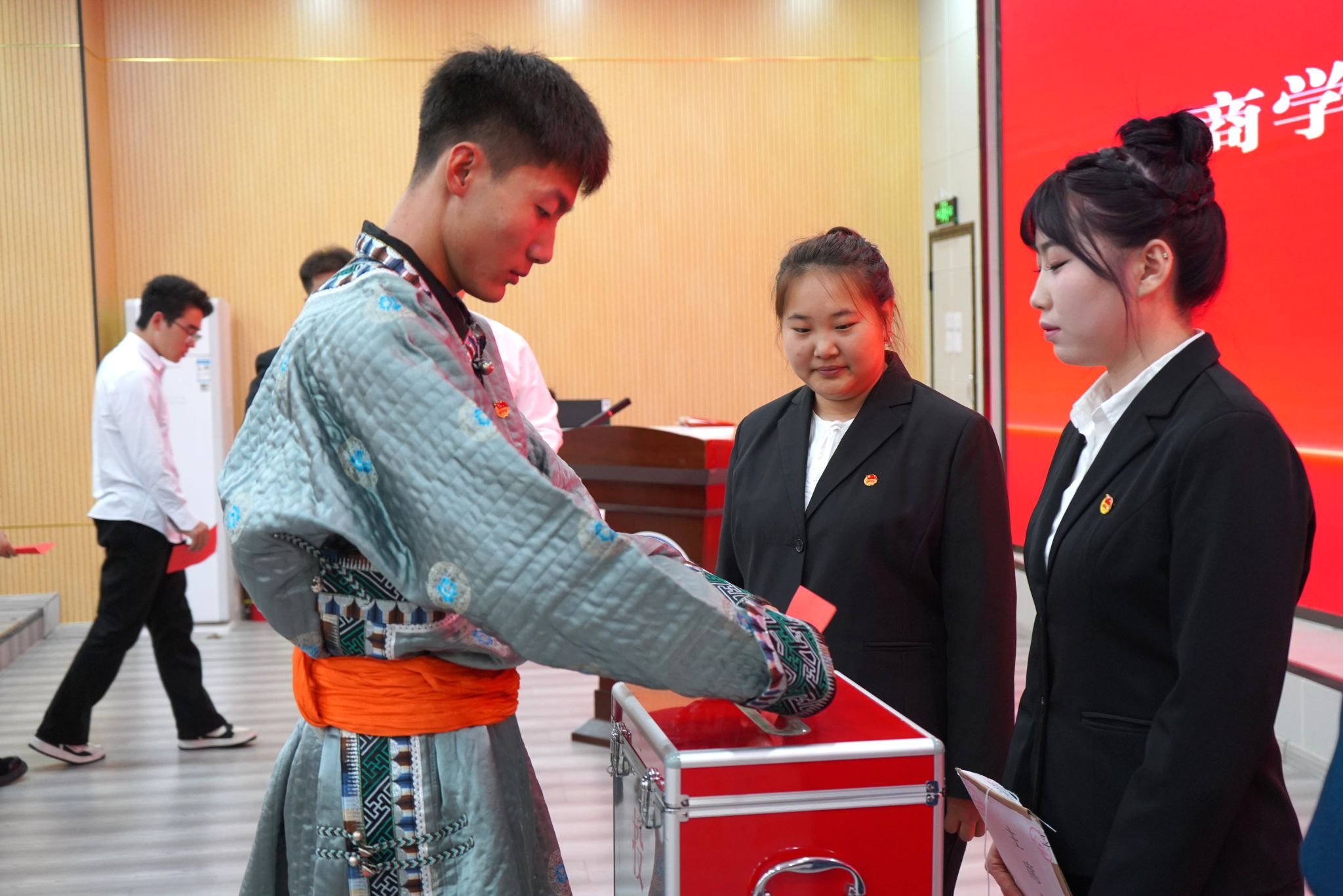 全体代表在会议上,审议并通过了《商学院学生会章程》《商学院学生代表大会选举办法》等相关议程。全体代表通过以无记名投票的方式,选举产生第二十六届刘佳圣等4名主席团成员,黄家琦等12名各部门部长。大会在团歌声中圆满落幕。