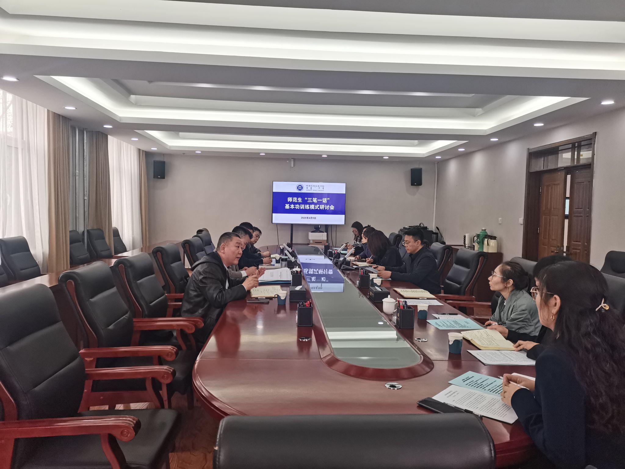 为落实人才培养方案,达成毕业要求相关能力点,进一步强化师范生基本功训练,学校师范生技能训练中心于4月9日上午组织召开了“三笔一话”基本功训练模式研讨会。学校党委委员、副校长额尔敦布和出席会议并讲话,具有师范类专业的学院相关负责同志、师范生技能训练中心全体人员参会。