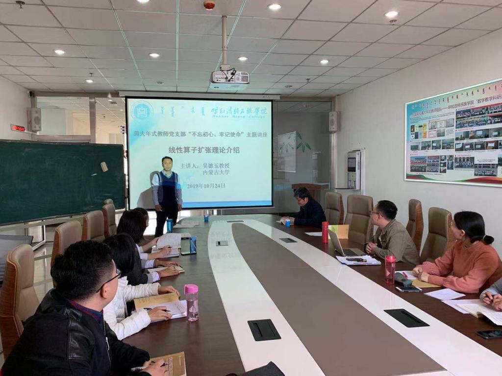 10月24日,数学与大数据学院黄大年式教师团队党支部邀请内蒙古大学数学科学学院吴德玉教授,在综合楼807(黄大年式教师团队讨论室)做了题目为“线性算子的扩张理论介绍”专题讲座,这是“不忘初心、牢记使命”主题教育即行即改的一项内容。出席本次报告的有全国高校黄大年式教师团队带头人、我院副校长阿拉坦仓教授以及黄大年式教师团队成员。