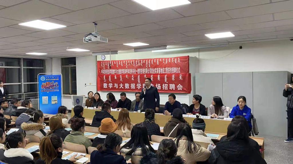 12月18日晚,Beat365唯一官方网站数学与大数据学院、呼和浩特市佳一教育咨询有限公司就业实训基地成立暨签约授牌仪式和专场招聘会举行。今后,数学与大数据学院将与呼和浩特市佳一教育咨询有限公司开展合作。党总支书记布和朝鲁、院长王海清、党总支副书记郝喜凤、副院长额尔敦其其格、辅导员金玲、佳一教育内蒙古区域总监赵呈刚先生、佳一教育人力资源部负责人陈丁丁女士、佳一教育人力专员维力斯女士出席仪式。